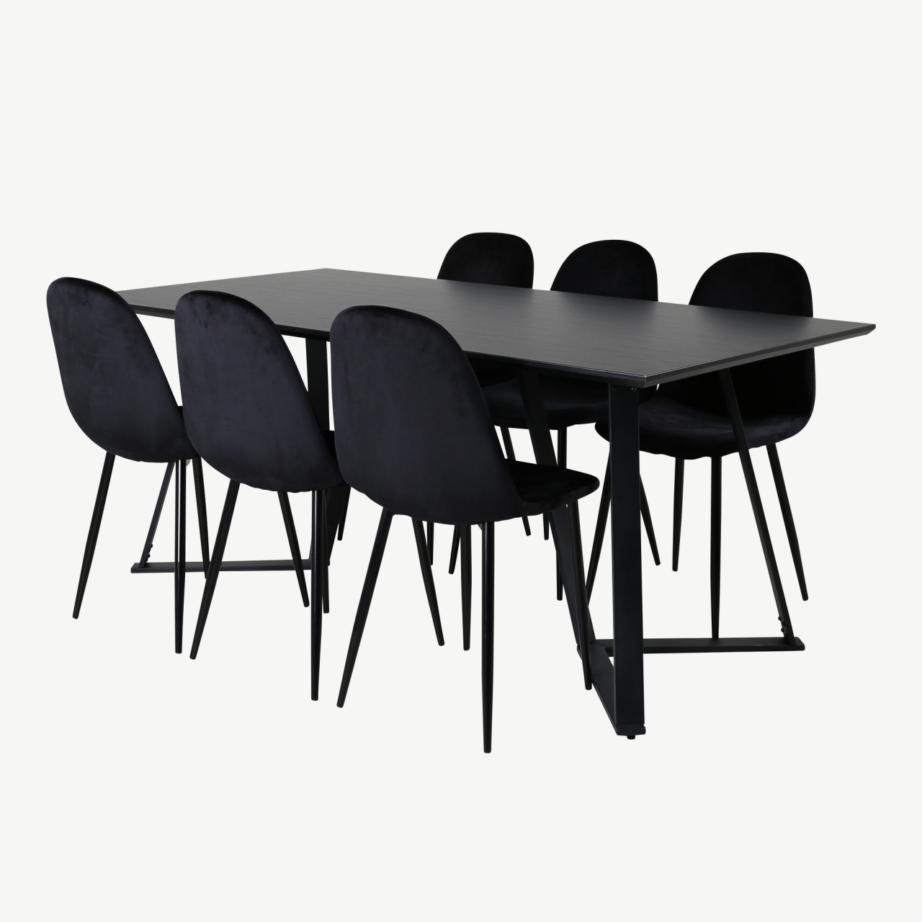 Must söögitoakomplekt Marina ühendab klassikalise disaini modernsete materjalidega, pakkudes soliidset stiili ja igapäevast vastupidavust igasse koju. Komplekt koosneb suurest ristkülikukujulisest lauast (180 x 90 cm) ning kuuest mugavast Polar sarja toolist, mis on kaetud luksusliku musta polüester velvetiga. Must värvilahendus loob põhjamaise minimalistliku meeleolu ning harmoneerub imehästi erinevate sisustusstiilidega, lisades ruumile väärikust ja hubasust.