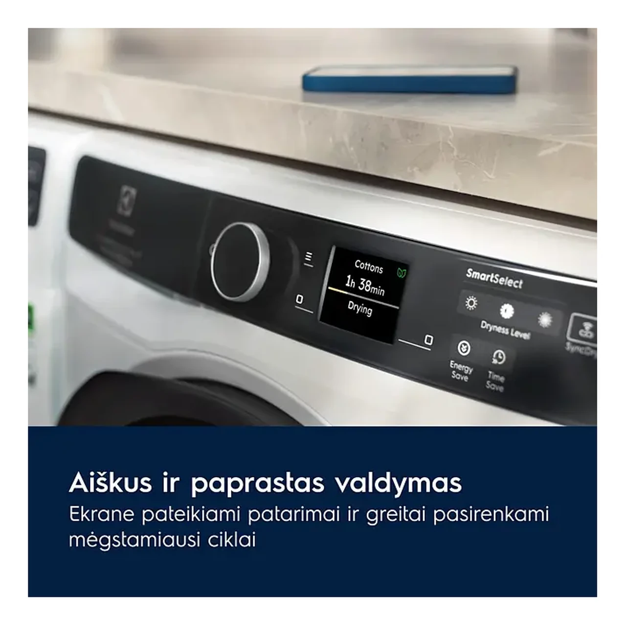 DynamicDisplay puuteekraaniga juhtpaneel kuvab tekstipõhiseid juhiseid ning teeb programmide valimise lihtsaks. Saad salvestada oma lemmikseaded ja pääseda neile kiiresti ligi mis vähendab korduvate toimingute arvu. Tänu Wi Fi ühendusele on võimalik ühendada seade Electroluxi rakendusega kus saab tsükleid käivitada ja jälgida ning saada soovitusi energiasäästlikuks kuivatamiseks. Nii on sul parem ülevaade kuivatamise kestusest ja energiakasutusest ka siis kui viibid mujal ruumis.