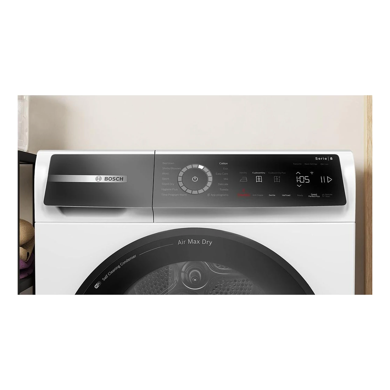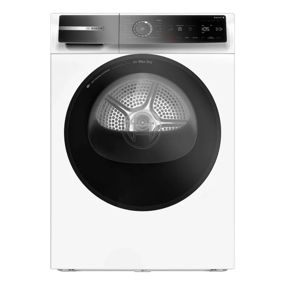 - Wi‑Fi ja nutijuhtimine võimaldavad kuivatit jälgida ja juhtida ühilduva rakenduse (nt Bosch Home Connect) kaudu, saada teavitusi programmi lõpust ning valida sobivaid seadistusi ka distantsilt.