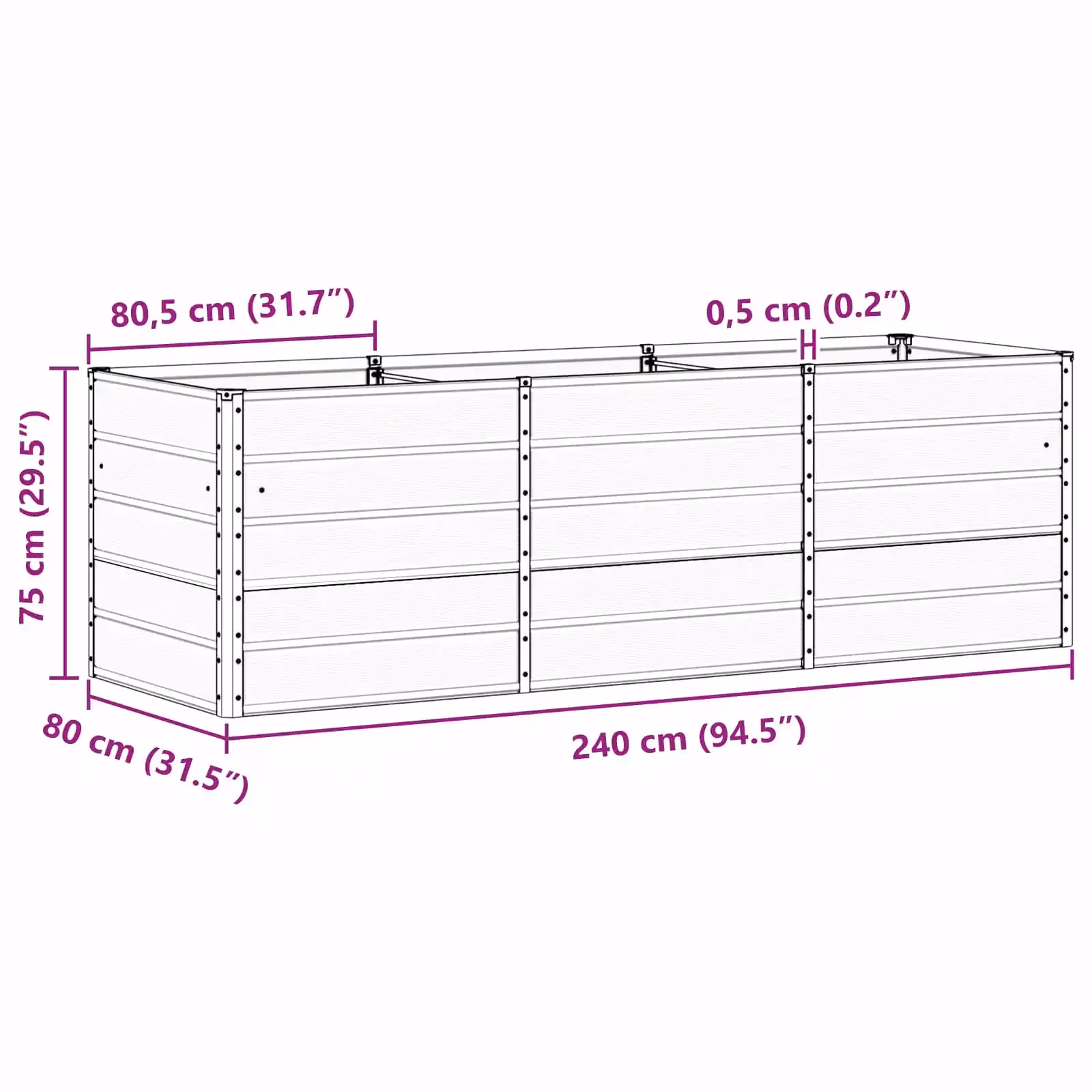 - Suur istutuspind: 240 x 80 cm põhjamõõt ja 75 cm kõrgus pakuvad rohkelt ruumi erinevate taimede kasvatamiseks ühes peenras.