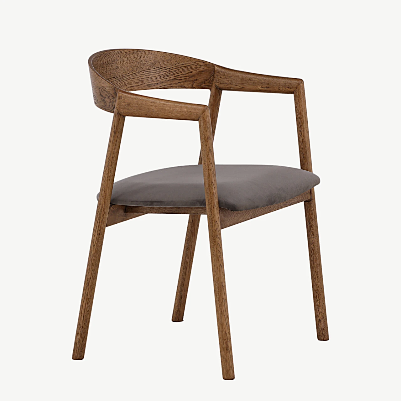Långön tammepuidust söögitool pakub stabiilset tuge tänu kergelt väljapoole kaldu jalgadele ning ergonoomilistele käetugedele. Sametkangast pehme polsterdus tagab luksusliku ja hubase istumiselamuse nii lühikeste kui ka pikemate õhtusöökide jaoks. Hallikas iste ja tagasihoidlik, skandinaavialik disain võimaldavad toolil harmoneeruda erinevate laudade ja sisekujundusstiilidega – olgu selleks modernne, klassikaline või põhjamaine interjöör.