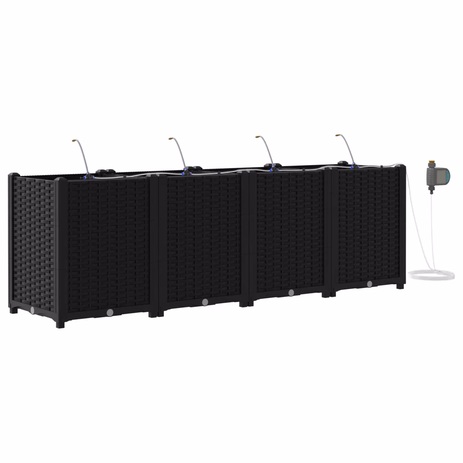 Need mustad terasest istutuskastid on praktiline valik, kui soovid aias või terrassil luua selgepiirilisi peenraid. Kastmissüsteem aitab hoida mullaniiskust ühtlasena, nii et taimed saavad vajaliku vee ka kuivemal perioodil. Neljast kastist koosnev 160 x 40 x 53 cm komplekt sobib hästi lillede, ürtide ja madalamate põõsaste kasvatamiseks välitingimustes.