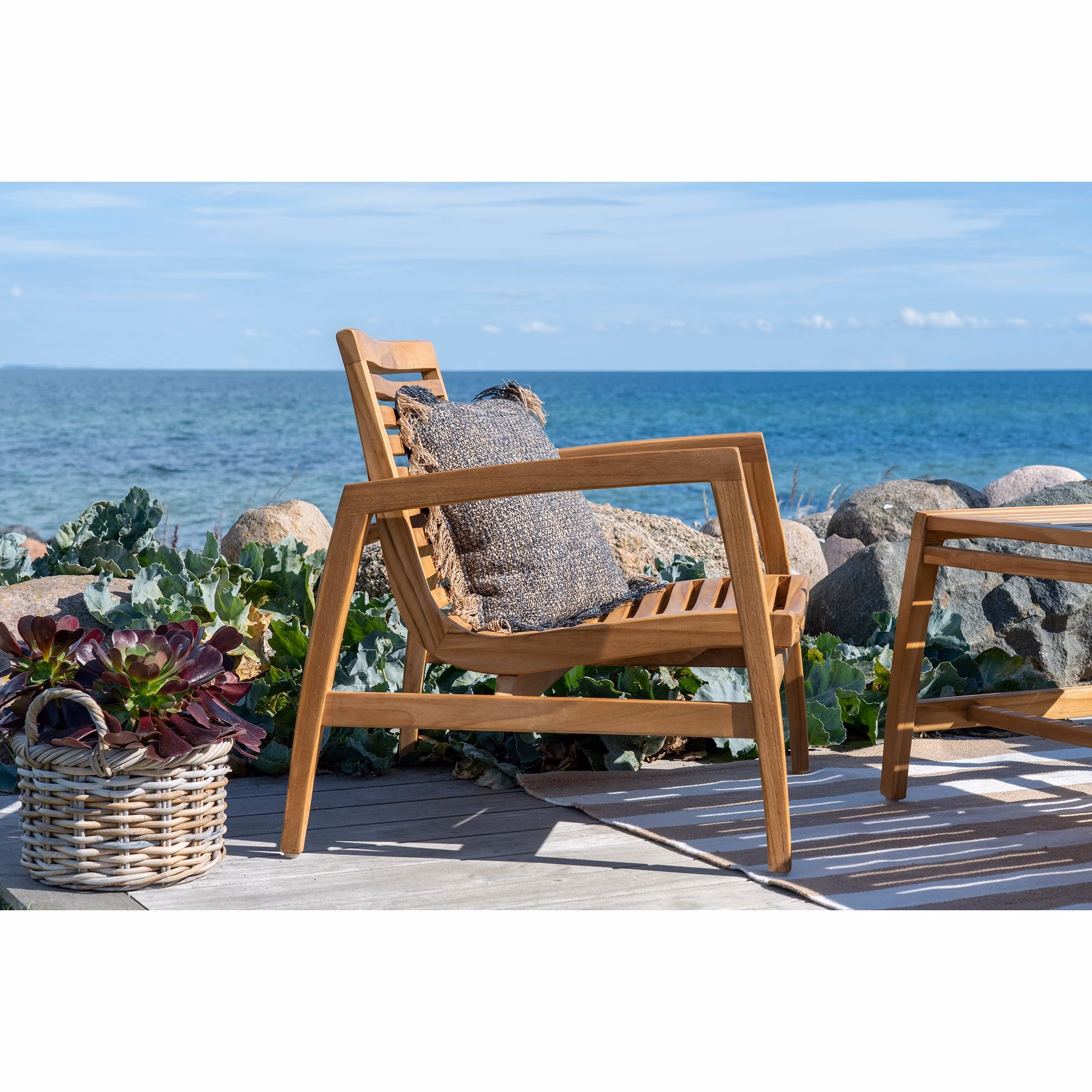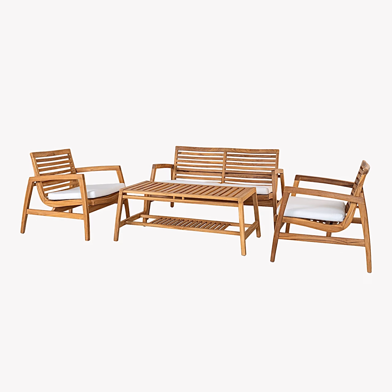 Lounge-komplekt sisaldab kahte tooli, pinki ja lauda koos istmepatjadega. Naturaalset tooni tiigipuit sobitub lihtsalt eri terrassi- ja aedlahendustega.
