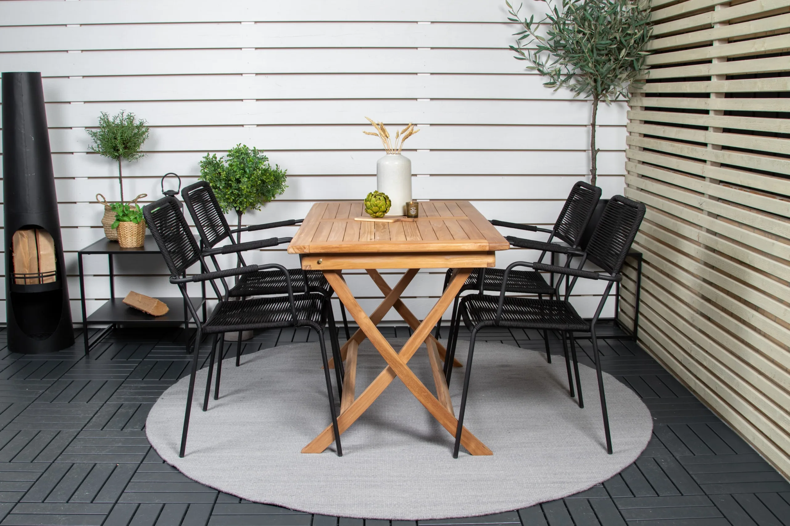 Tiigipuust aiakomplekt Kenya ühendab ajatult skandinaavialiku stiili, vastupidavuse ja maksimaalse mugavuse. See komplekt lisab Sinu terrassile või aiale hubasust ning loob silmapaistva, tervikliku sööginurga. Komplekti kuulub naturaalsest tiigipuust ristkülikukujuline laud ja kuus musta Lindos sarja tooli terasraami ning vastupidava köispunusega.