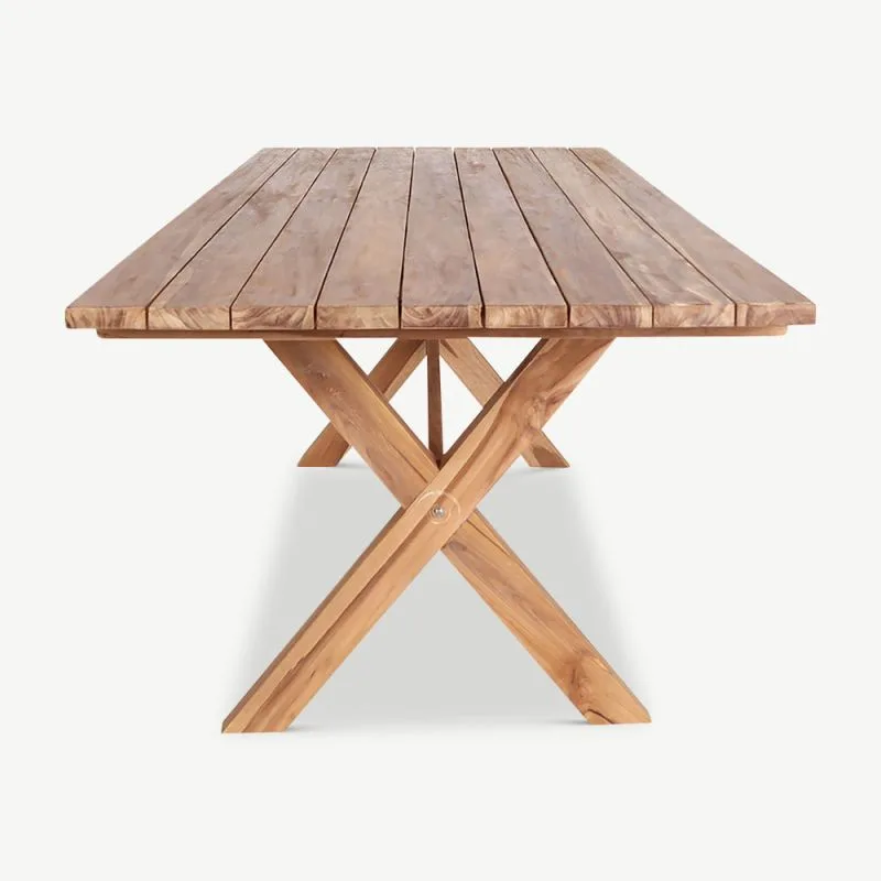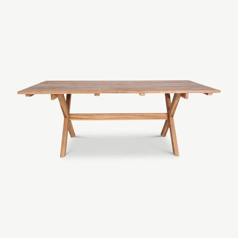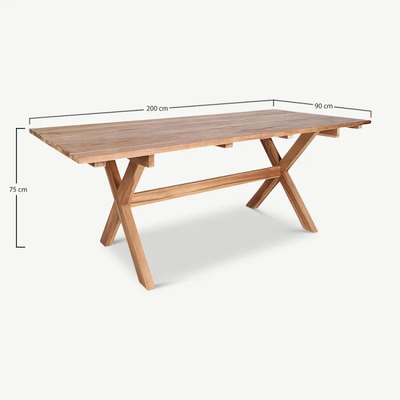 Laua mõõtmed – 200 cm pikk, 90 cm lai ja 75 cm kõrge – pakuvad mugavat istumiskohta kuni kuuele inimesele. Tänu oma ristkülikukujulisele vormile sobib see suurepäraselt nii pereõhtusöökideks kui ka suuremateks koosviibimisteks. Lauajalad ja pealispind on valmistatud täies mahus kvaliteetsest tiigipuust, tagades stabiilsuse ning pikaealisuse. Lisaks on laud lihtsasti monteeritav, muutes selle kokkupaneku mugavaks ja kiireks.