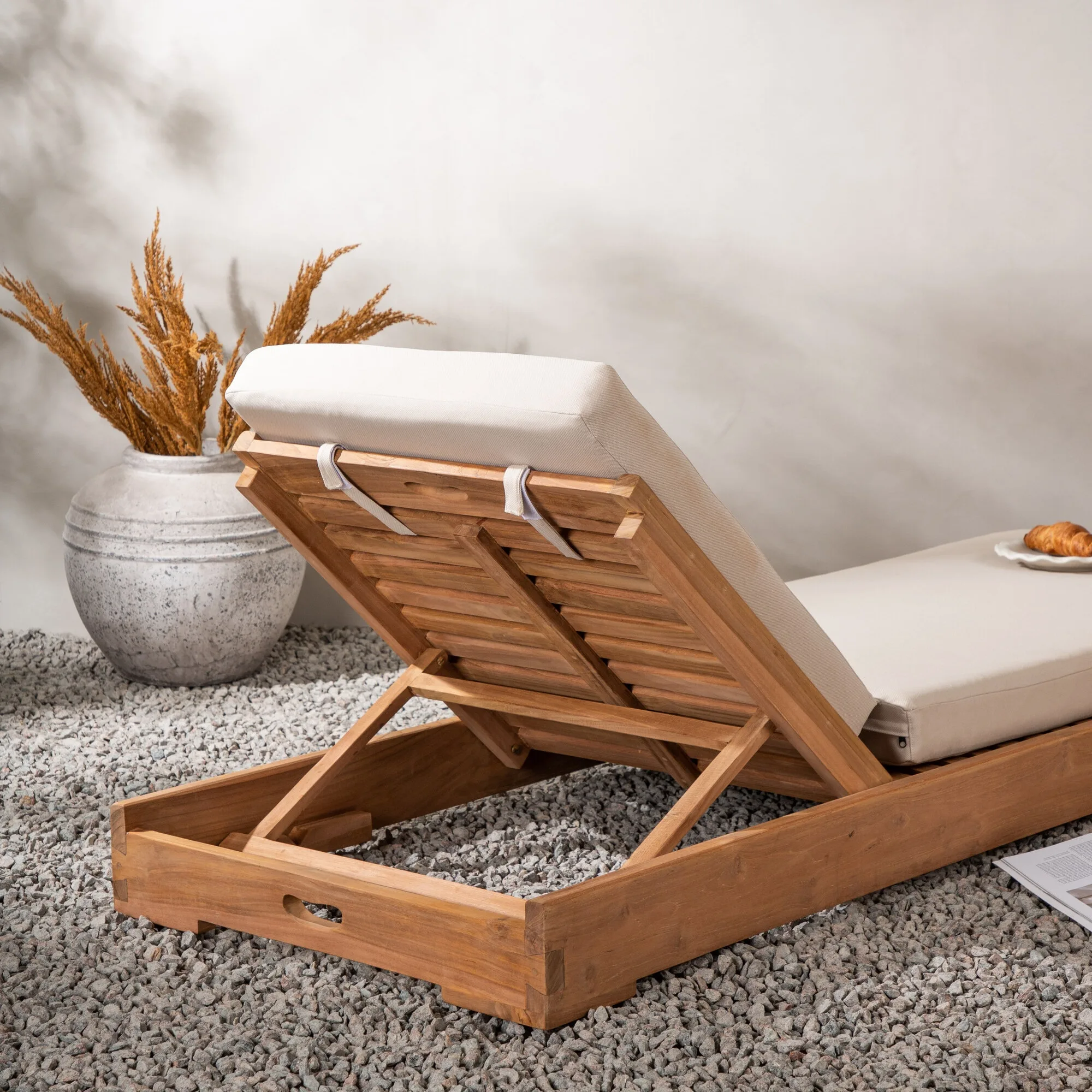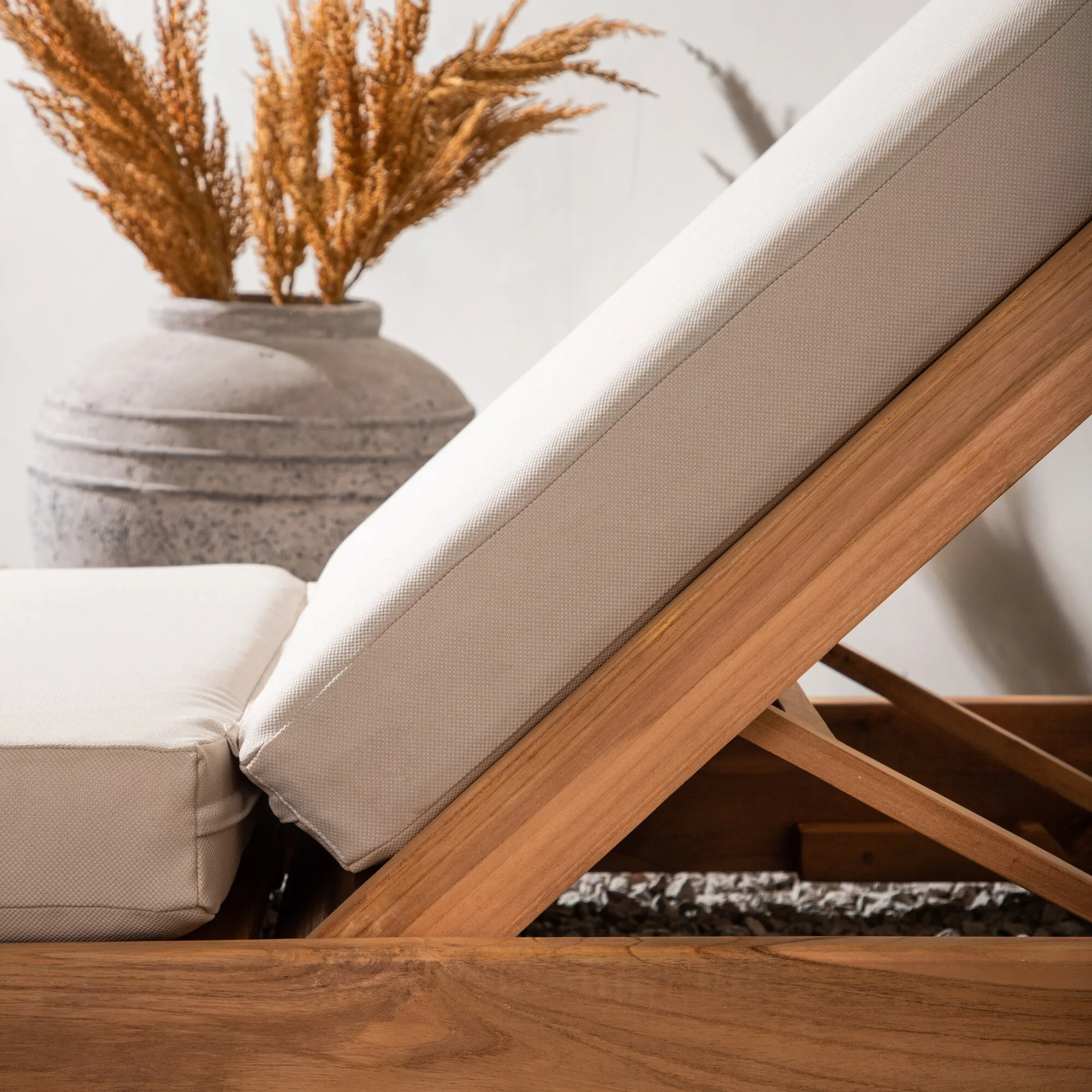 Minimalistlik ja ajatult elegantne disain muudab selle lamamistooli mitmekülgseks sisustuselemendiks, mis sobib erinevate aiamööblikomplektidega. Tiigipuidu soe toon ja beež pehmendus loovad harmoonilise ja kutsuva atmosfääri igas väliruumis.