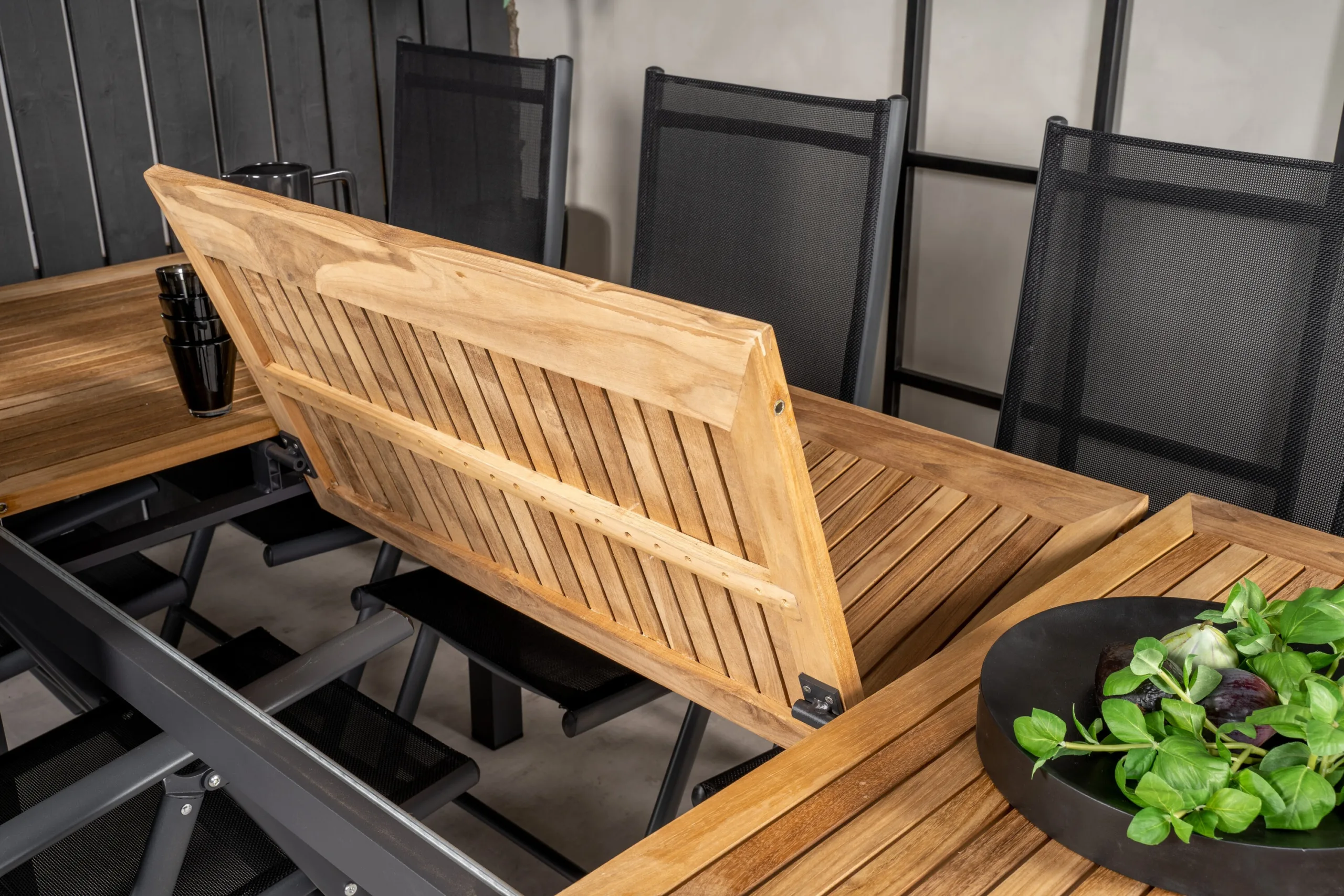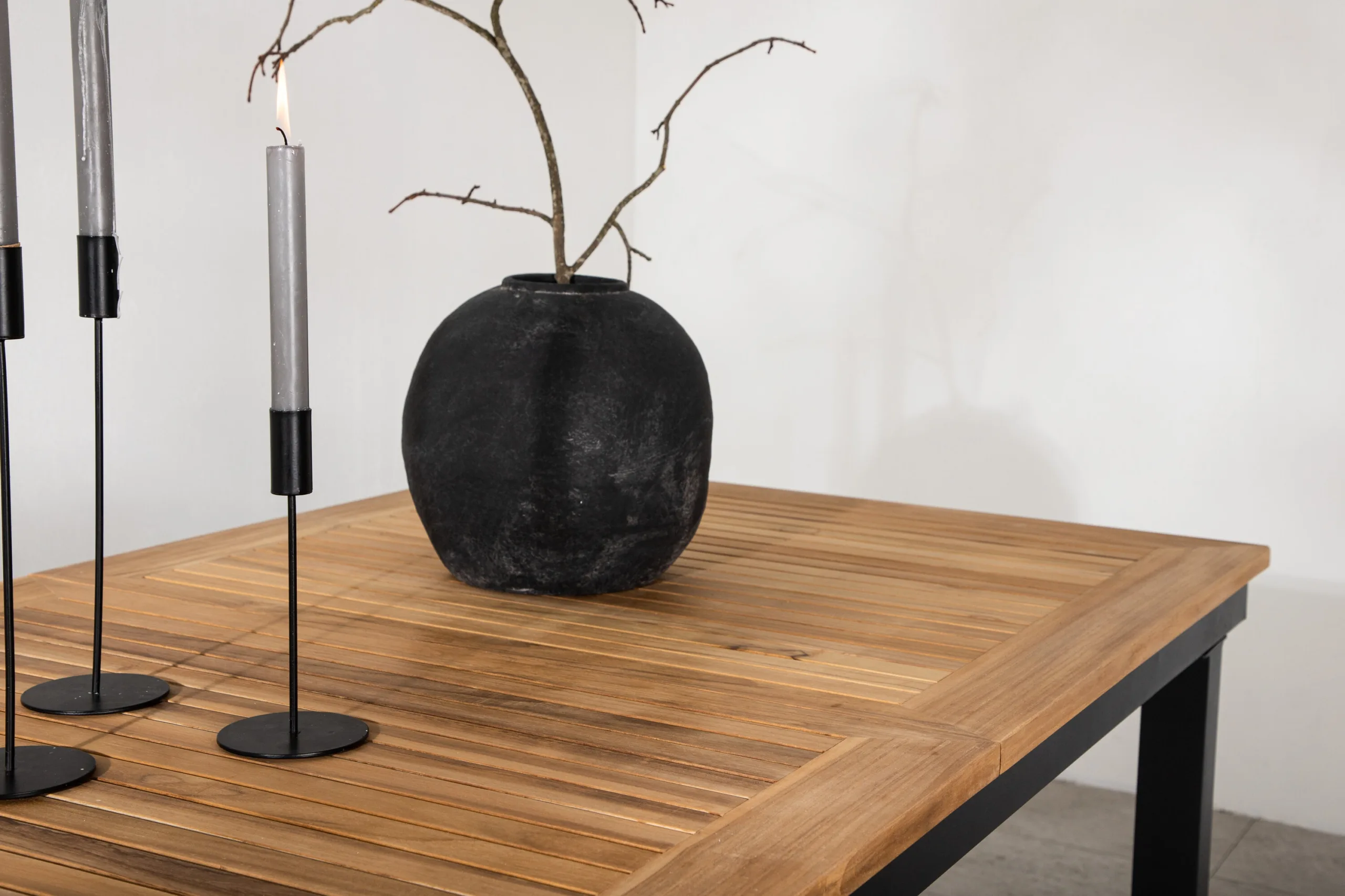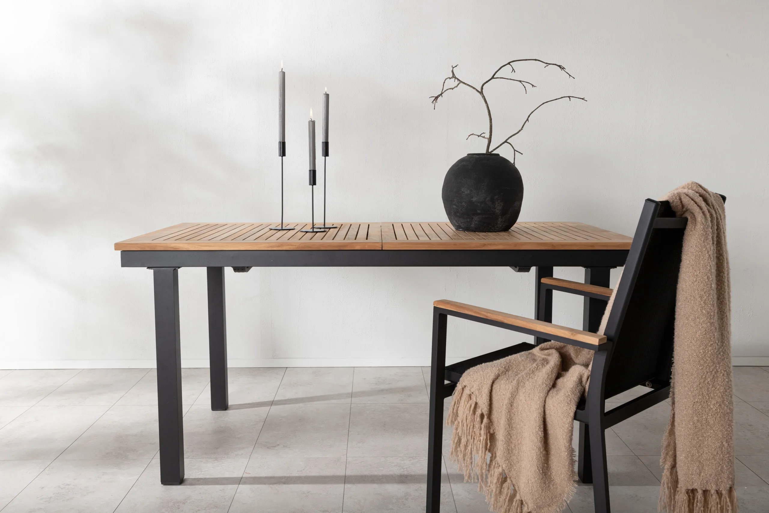 Panama söögilaud ühendab endas loodusliku ilu ja praktilisuse. Tiigipuidu soe toon ja must metallist raam loovad tasakaalustatud kontrasti, mis sobib nii klassikalisse kui ka kaasaegsesse aeda. Tänu oma nutikale kujundusele on see laud suurepärane koht pereringis einestamiseks või sõpradega aja veetmiseks.