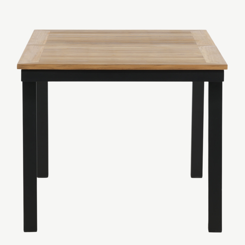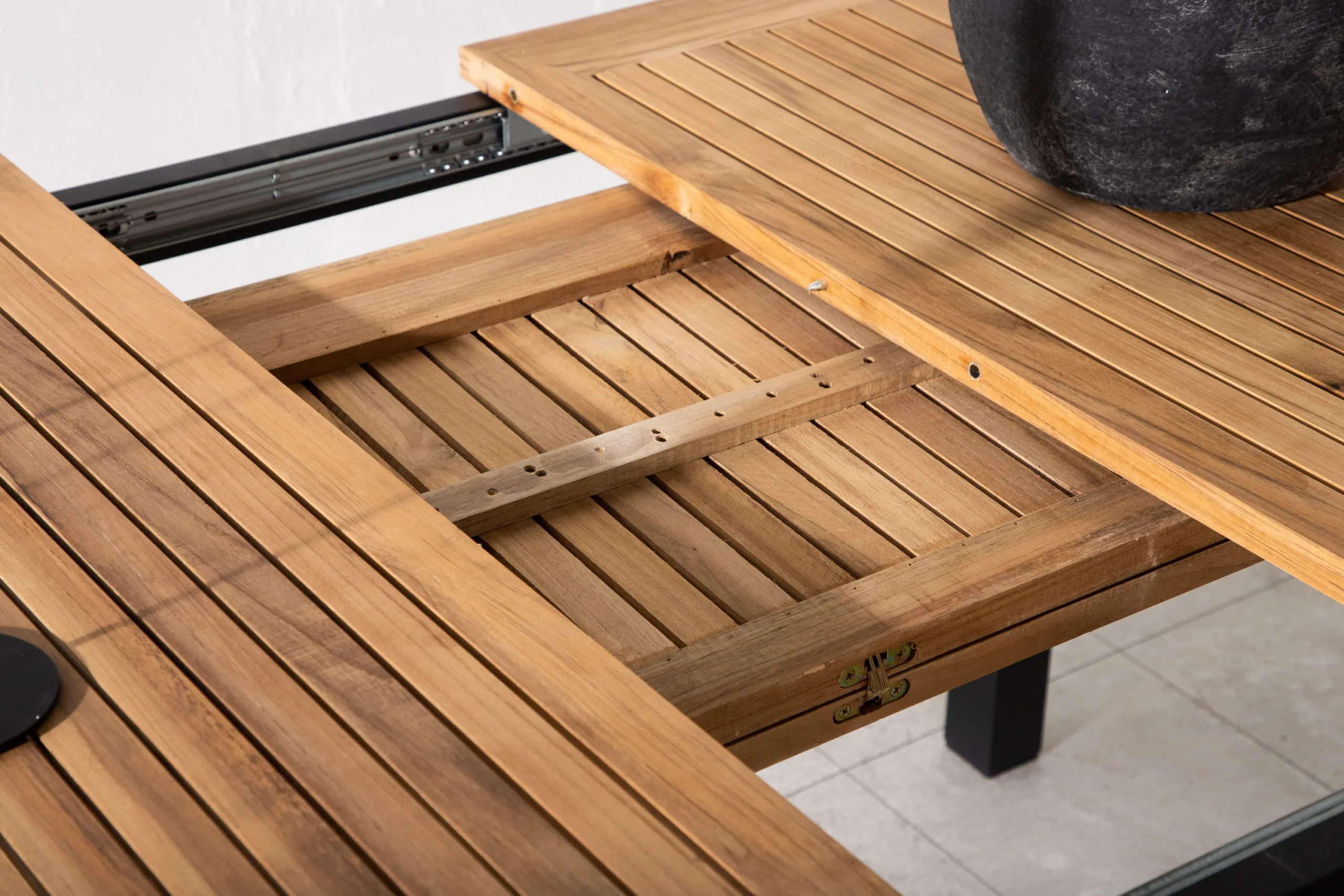 Laua pealisplaat on valmistatud tiigipuust, mis on tuntud oma erakordse vastupidavuse ja loodusliku õlirikkuse poolest. Tiigipuit talub hästi ilmastikutingimusi, muutes selle ideaalseks välimööbliks. Laua must metallist raam tagab tugevuse ja stabiilsuse, lisades samal ajal modernse ja stiilse välimuse.