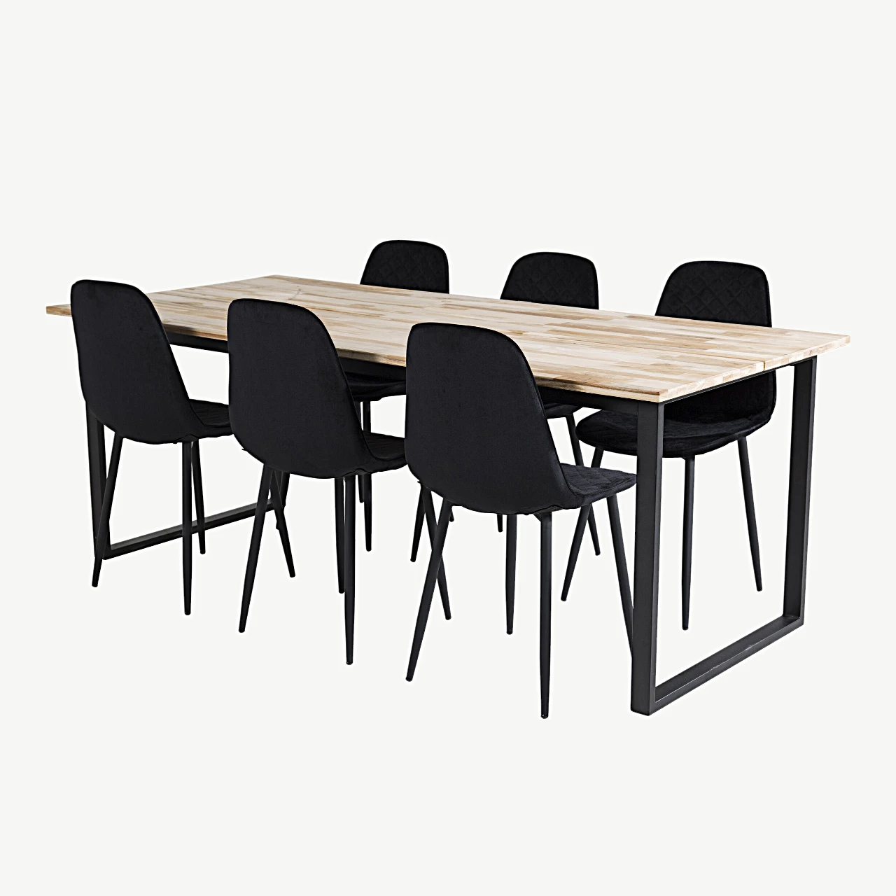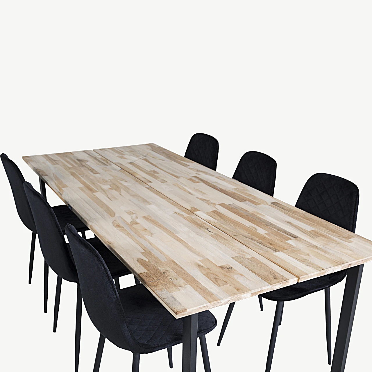 • Laud: Klassikalise kandilise kujuga söögilaud (200 x 90 x 75 cm), mille tugev lauaplaat on valmistatud vastupidavast tiigipuust. Mustad metallist jalad lisavad modernset elegantsi ja stabiilsust.
