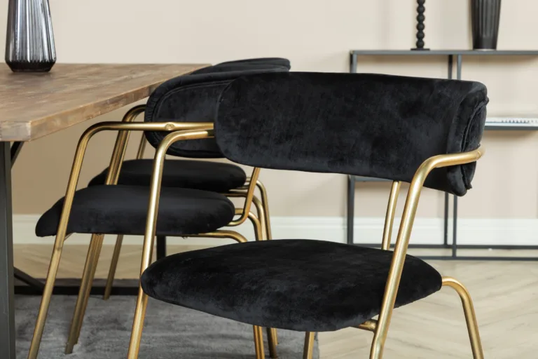 - Kuldsed terasest jalad – vastupidavad ja dekoratiivsed, lisades toolidele luksusliku kontrasti ning koondades kogu tiigipuust söögilauakomplekti stiilseks tervikuks.