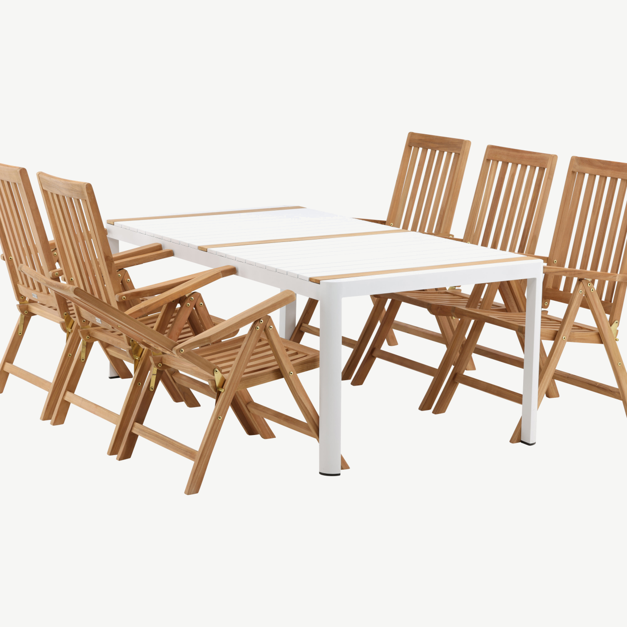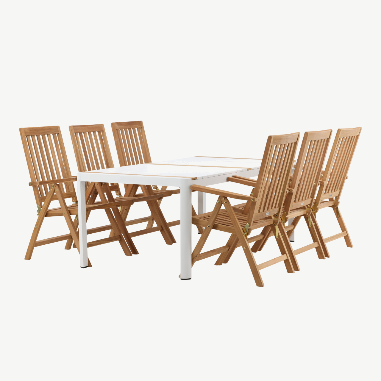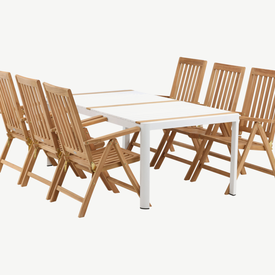Kaunista oma terrass või aed elegantse ja vastupidava valge tiigipuidust aiamööbli komplektiga. Komplekti kuulub modernne ristkülikukujuline laud, millel on valge pulbervärvitud alumiiniumist raam ja tiigipuidust lauaplaat ning kuus Kenya sarja kokkupandavat, viies asendis reguleeritavat tiigipuidust tooli. See põhjamaise joonega mööbel loob su väliruumis ajatu ning kutsuva õhkkonna.