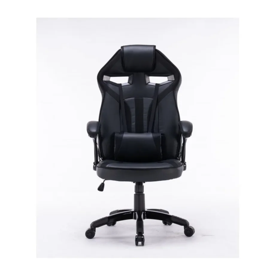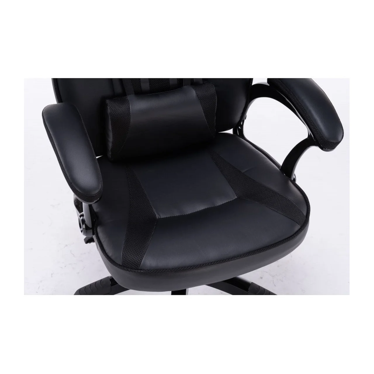 Must faux nahast mänguritool kaelapadjaga, reguleeritava kõrguse ja pehmete käetugedega tagab mugavuse pikaajalisel kasutamisel.