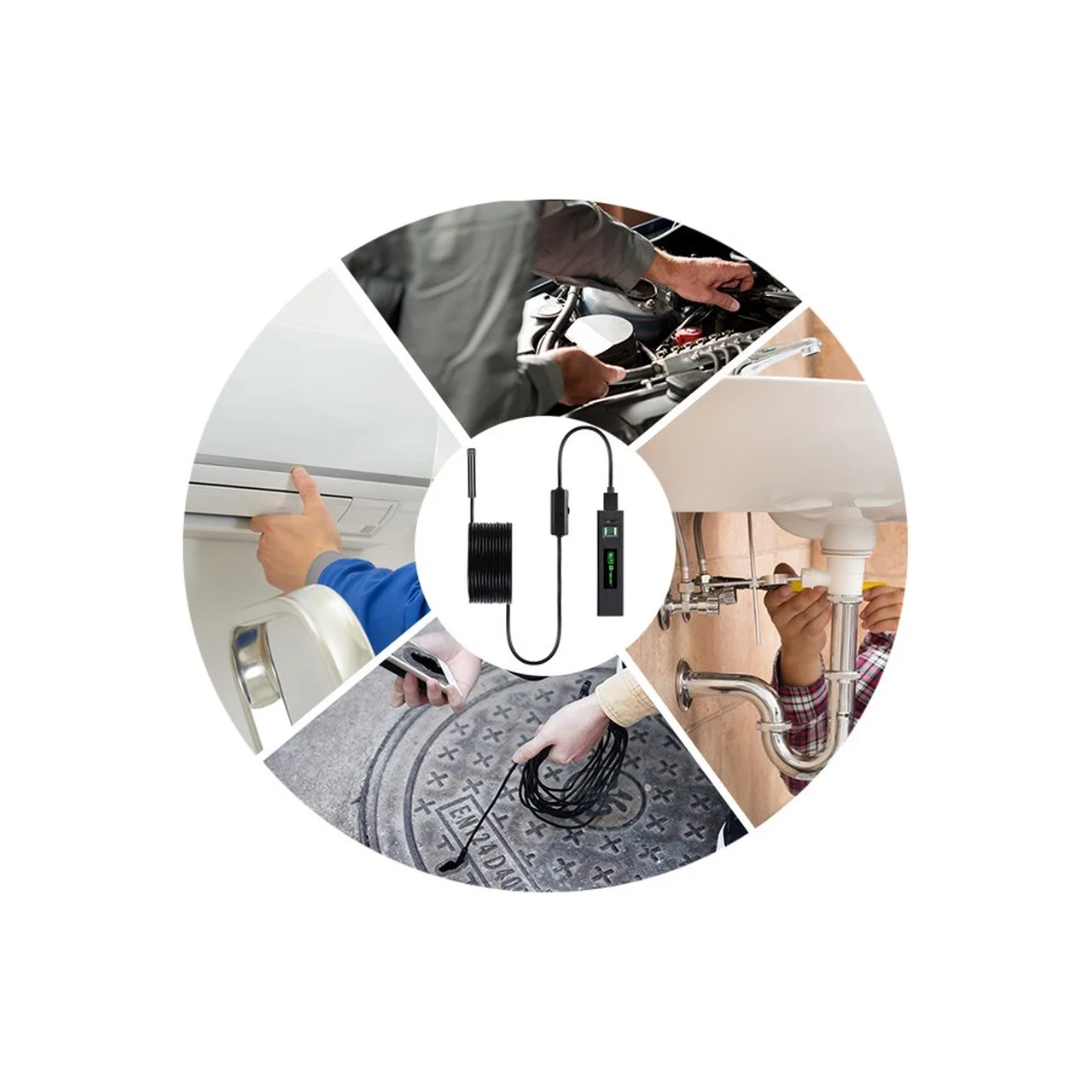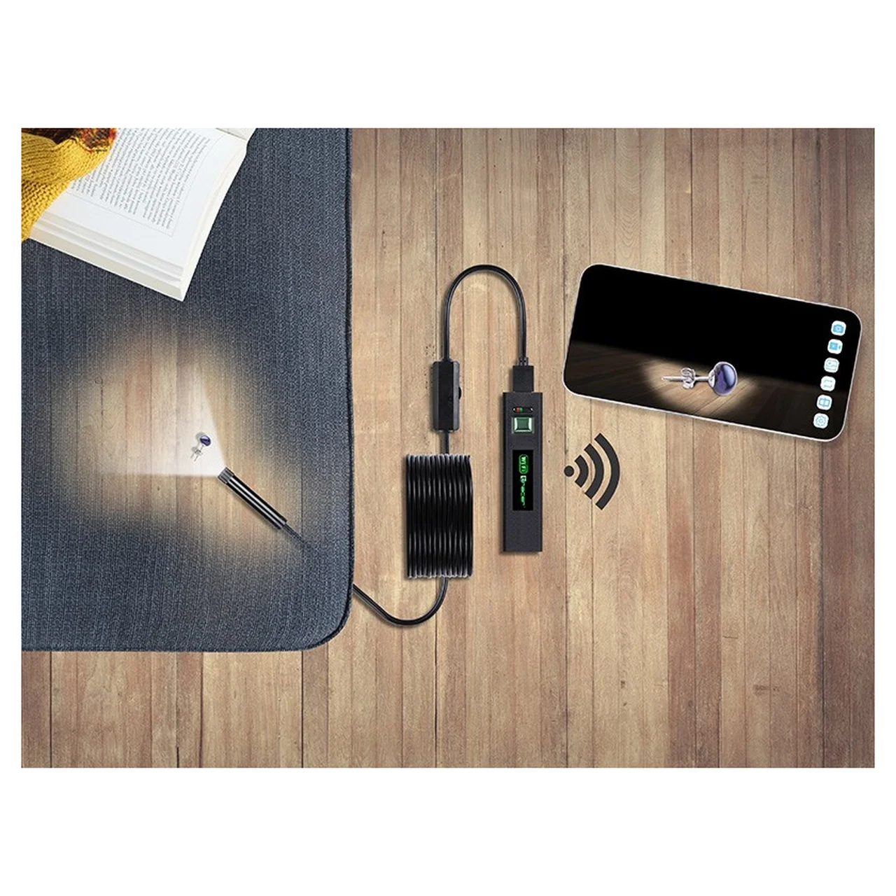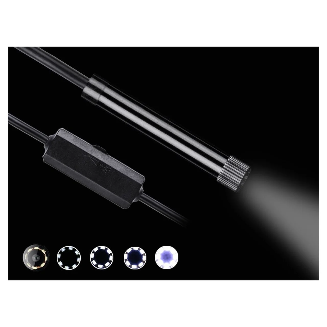 Kasutamiseks ühenda endoskoop komplektis oleva USB-kaabli abil arvutiga. Videopildi ja fotosalvestiste saamiseks kasuta vastavat tarkvara või rakendust. Läbipaistev juhtmeotsik võimaldab kuvada pilti 70° ulatuses ka kitsastes või kõverates kohtades. Vajadusel reguleeri 6 LED-valgusti eredust, et saada optimaalne vaade. Komplektis oleva konksu abil saab väikseid esemeid torudest või õõnsustest välja tõmmata ning peegel võimaldab jälgida nurga all olevaid kohti.
