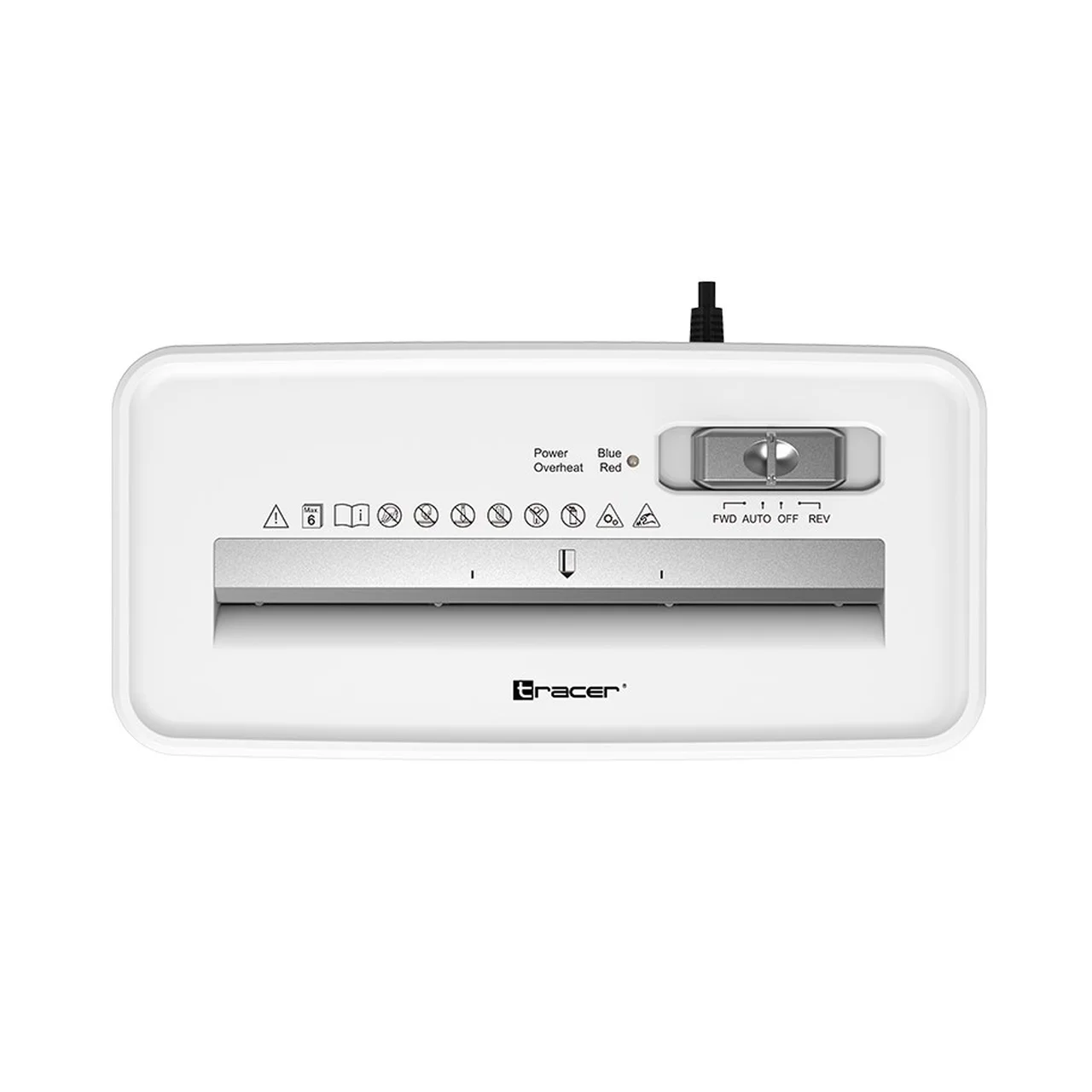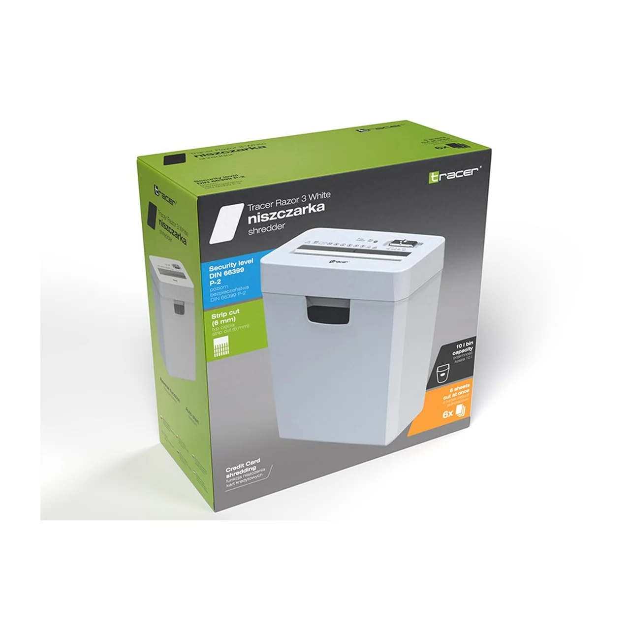 Valge Tracer Razor 3 paberipurustaja hävitab kuni 6 lehte korraga ja lõikab need 6 mm ribadeks, mahutades jäätmed 10-liitrisesse prügikasti.