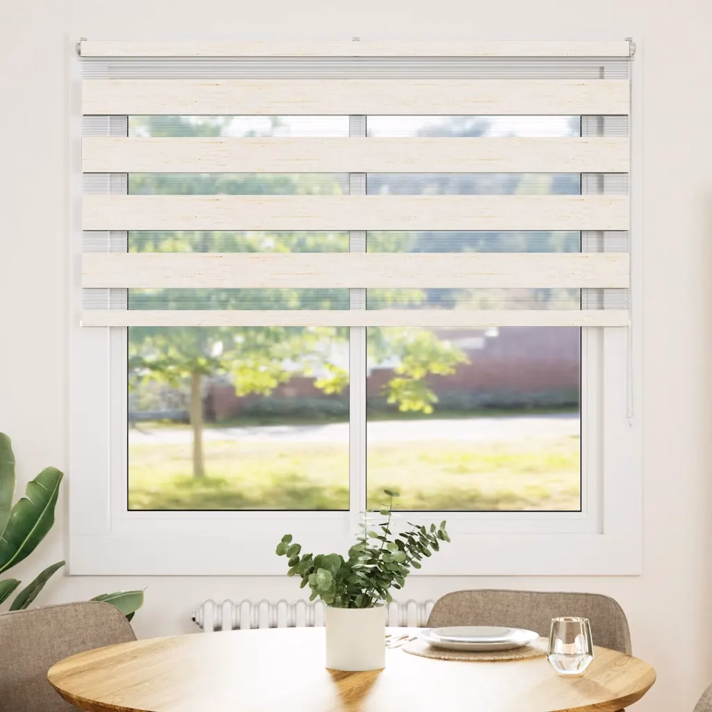 - Kahekihiline sebra-kangas vahelduvate läbipaistvate ja läbipaistmatute ribadega (umbes 7,5 cm ja 5 cm), mis võimaldab valguse ja privaatsuse täpset reguleerimist.