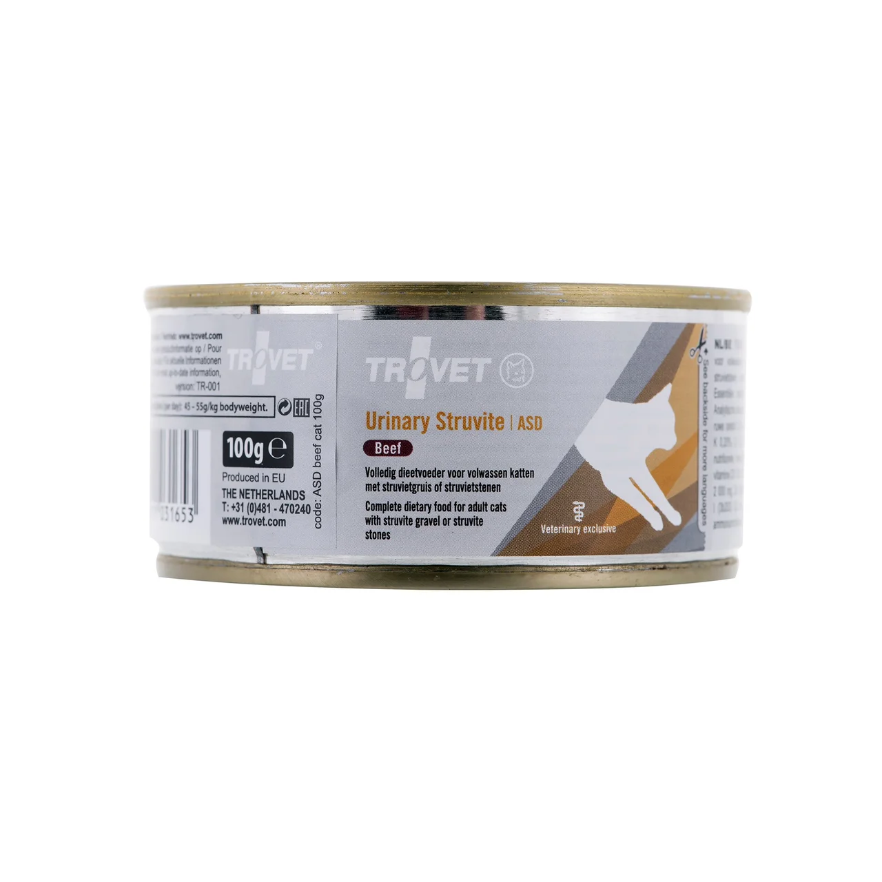 Trovet ASD Urinary Struvite with beef on spetsiaalne veterinaarne märgtoit täiskasvanud ja eakamatele kassidele, kes vajavad abi kuseteede tervise toetamisel. See dieet on välja töötatud struviitkivide (uriinikristallide) lahustamiseks ja nende taastekke vältimiseks, aidates hoida lemmiku uriini pH-d optimaalsel tasemel. Toit sobib kõigile kassitõugudele ning sisaldab kvaliteetset veiseliha. Gluteenivaba ja ilma kunstlike säilitus- ning värvaineteta retsept on loodud kassi heaolu silmas pidades.