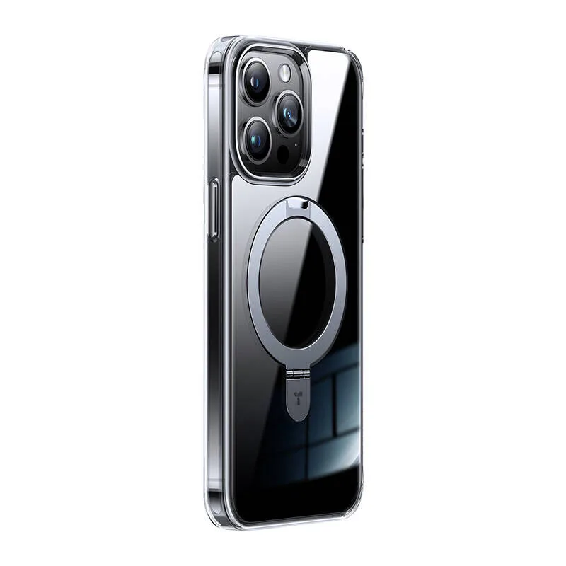 Tugijalaga magnetümbris Torras Ostand Clear iPhone 15 Pro, läbipaistev, Halbach-magnetid, ühilduv magnettarvikutega, 40–120° jalg, tugevdatud nurgad, militaarstandard kaitse