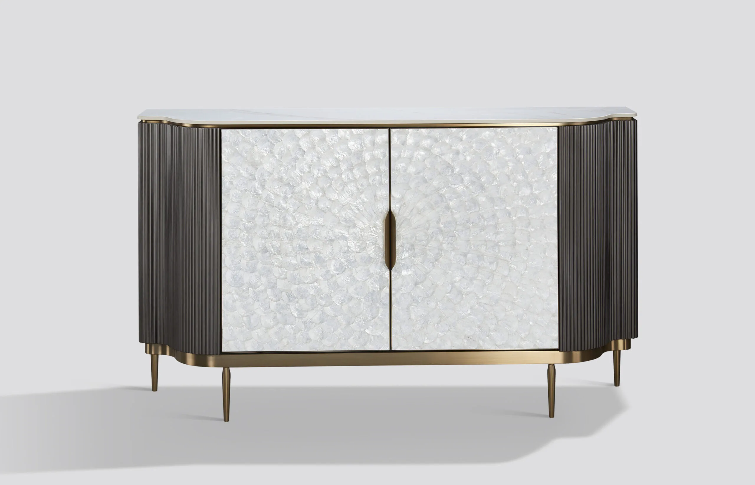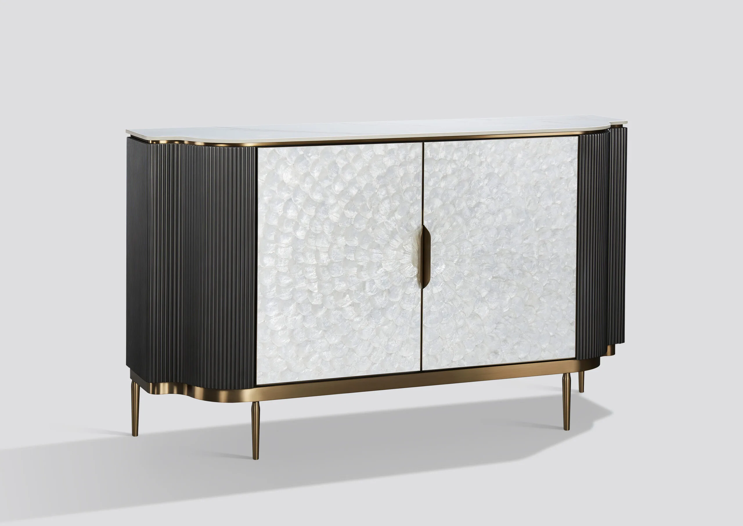 Stilig ST906B kummut elutuppa. See ainulaadne grafiidivärvi kummut on tõeline pilgupüüdja, mille esikülg on kaetud sümmeetrilise mustriga naturaalse merekarbiga. Kapi korpus on kaunistatud soonelise puidu ja marmorviimistlusega, mis lisab sellele luksuslikku tunnetust.