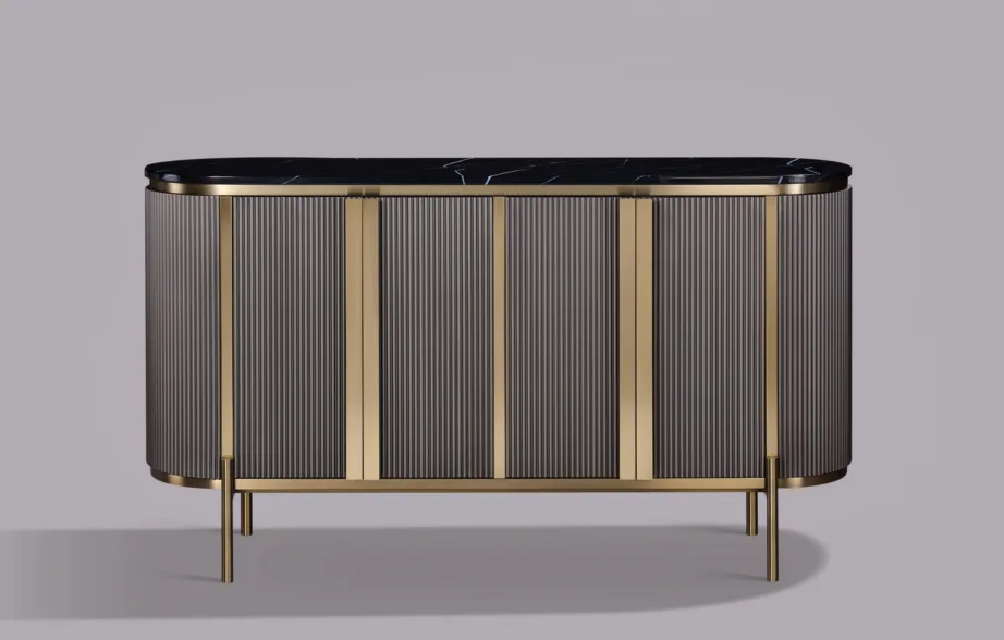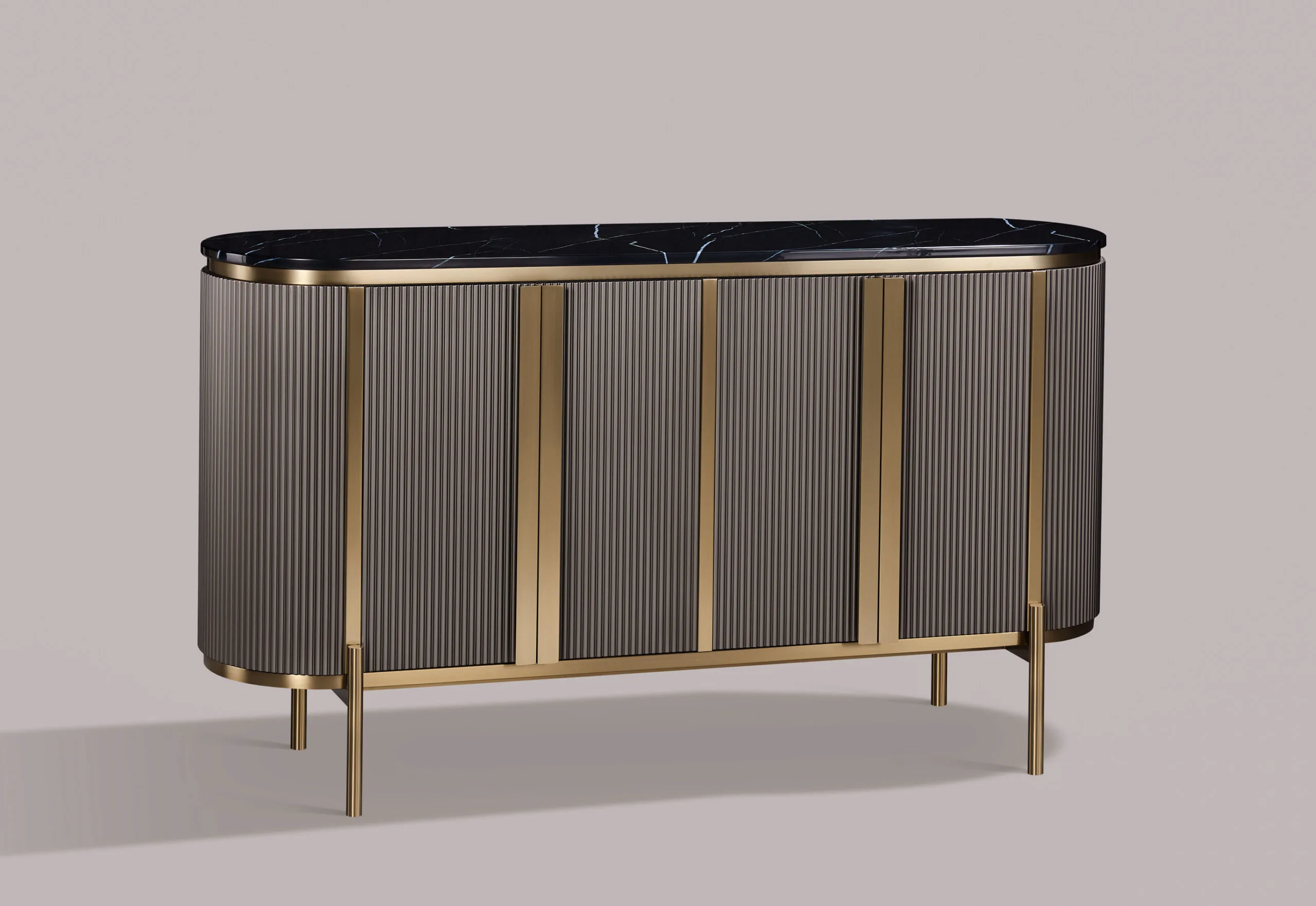 Stilig ST384A TV-alus elutuppa. See elegantne grafiitvärvi vitriinkapp kuldsete aktsentide ja jalgadega lisab teie elutuppa rafineeritud stiili. Kapi korpus on valmistatud soonelise puidu viimistlusega, mis annab sellele unikaalse ja modernse ilme. Musta marmori viimistlusega tööpind lisab luksuslikku puudutust ja praktilisust.