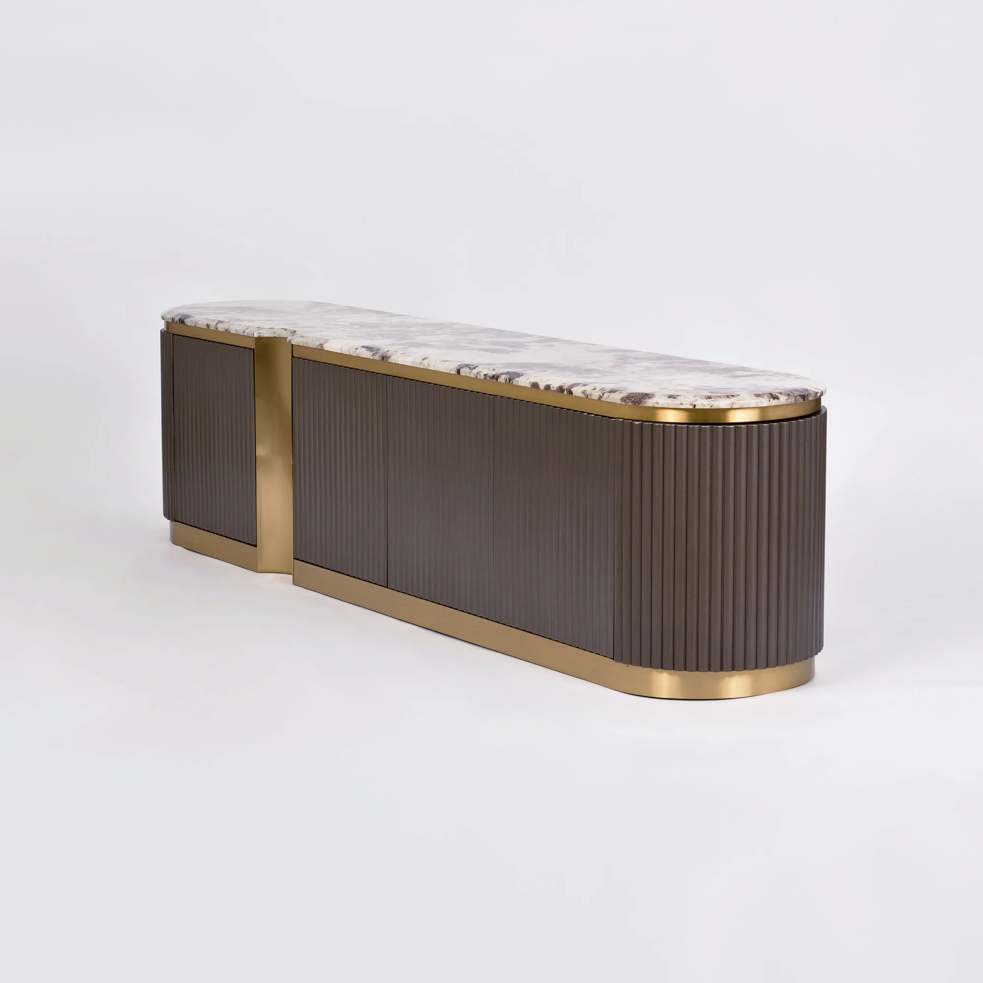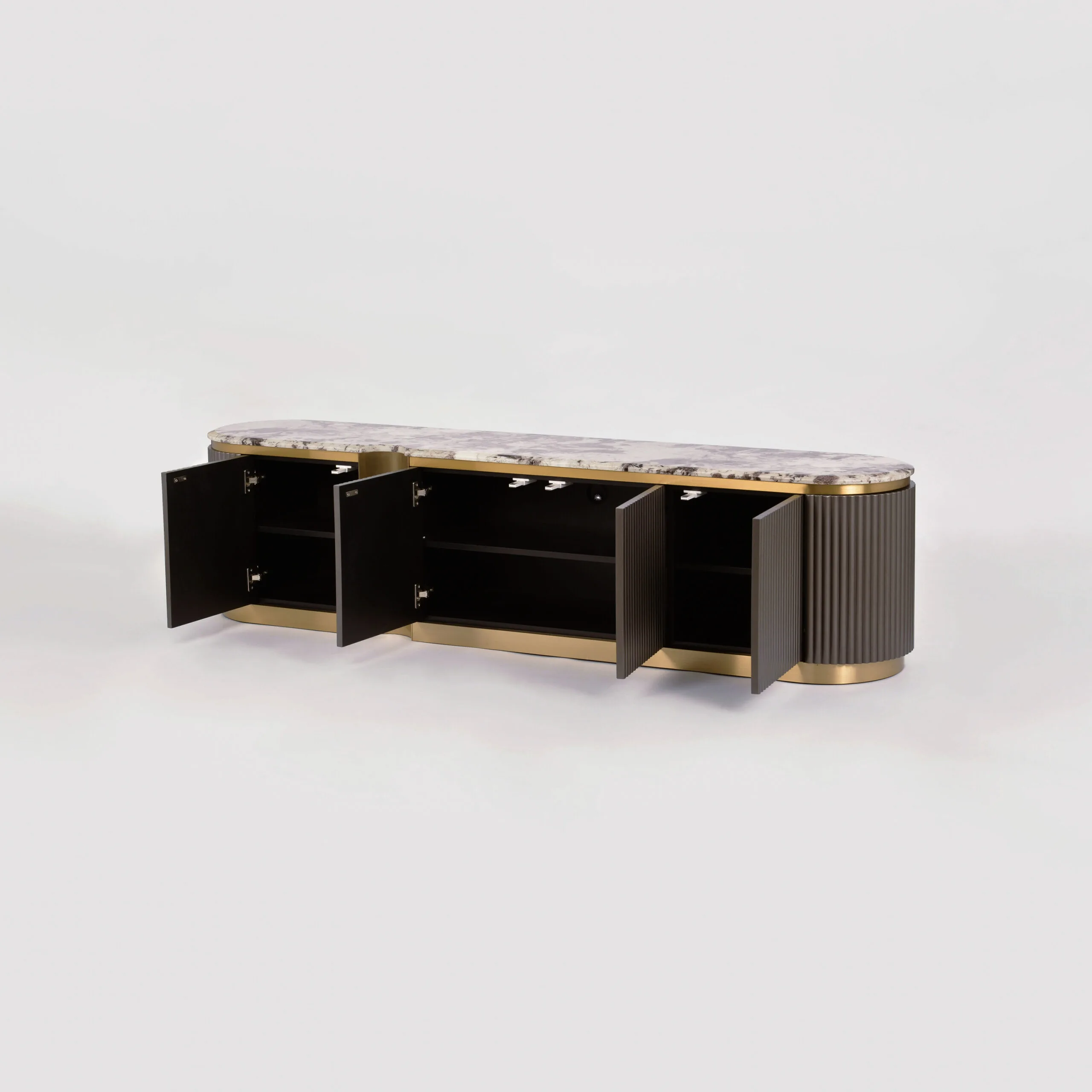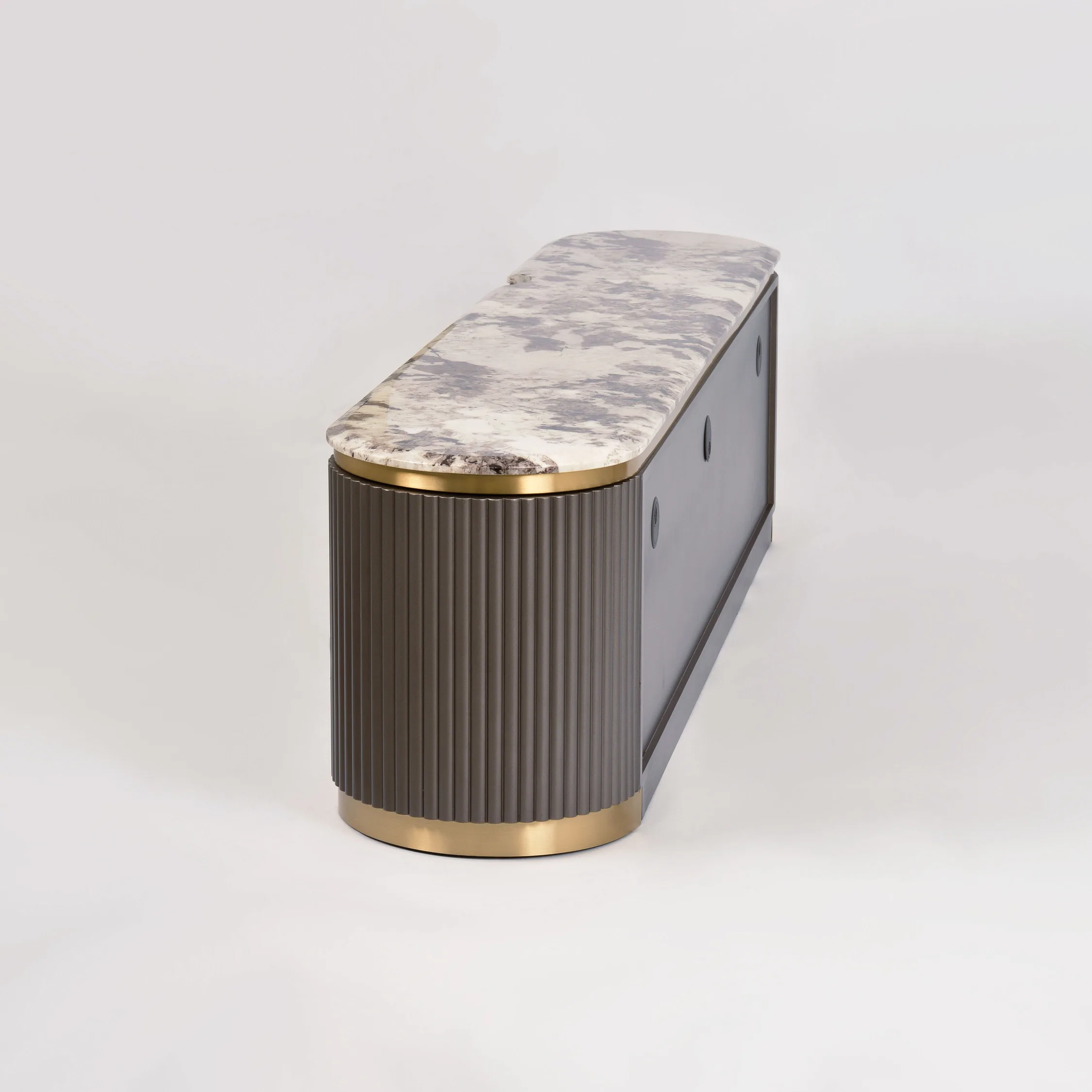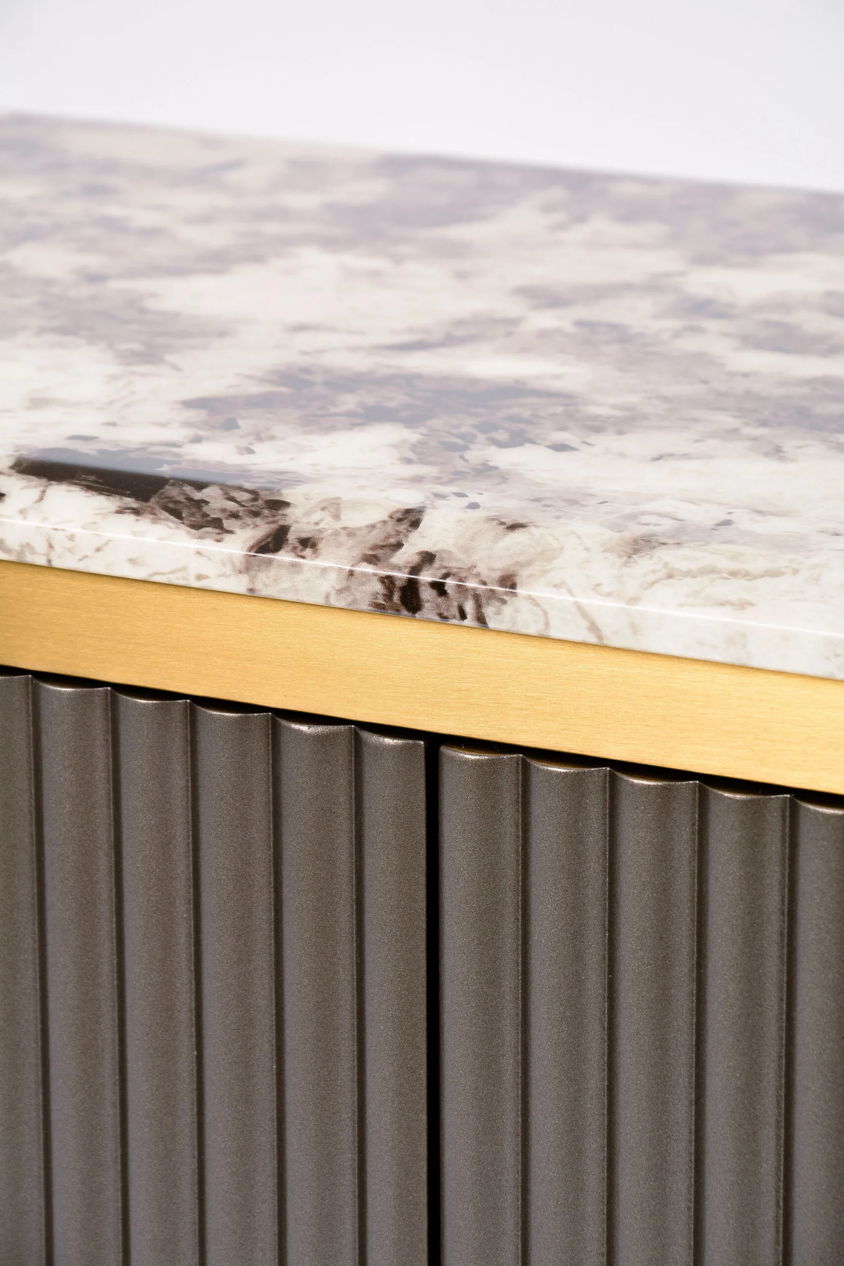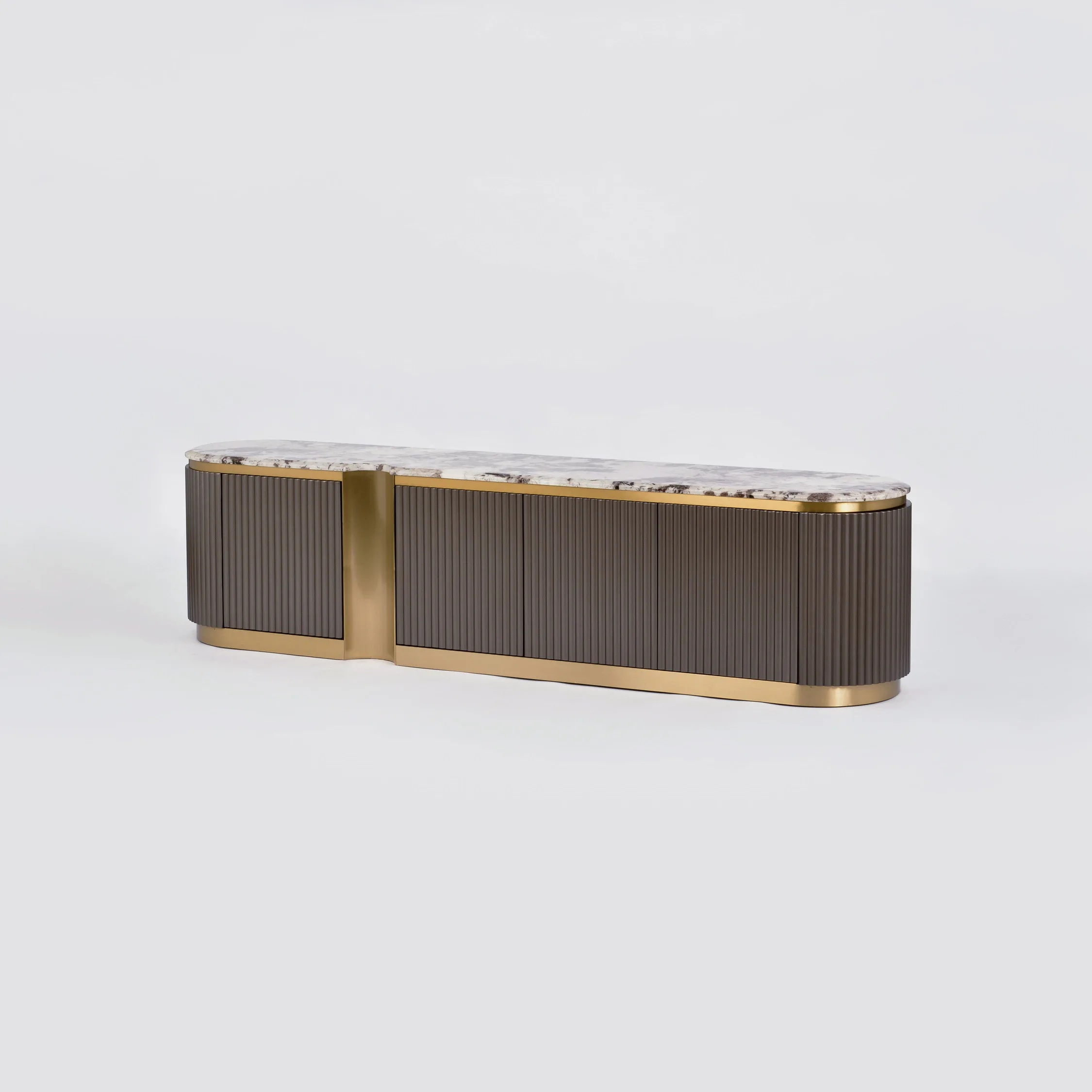 Stilig ST916 TV-alus elutuppa. See stiilne tume grafiidivärvi TV-alus kuldsete aktsentide ja alumise pärjaga lisab teie eluruumi elegantsi ja modernsust. Korpuse sooneline puit ja marmorviimistlusega töötasapind loovad luksusliku ja ajatu ilme.