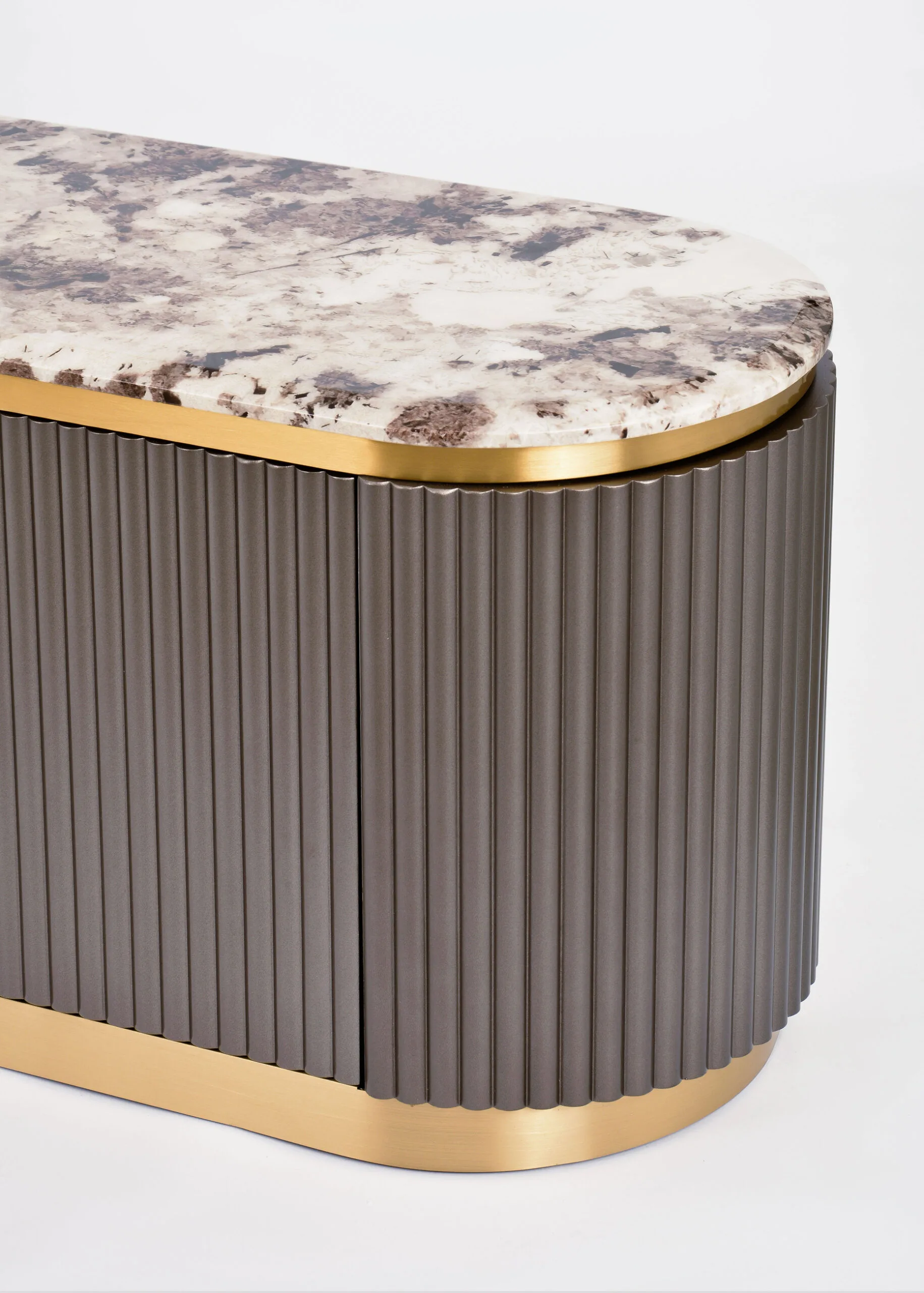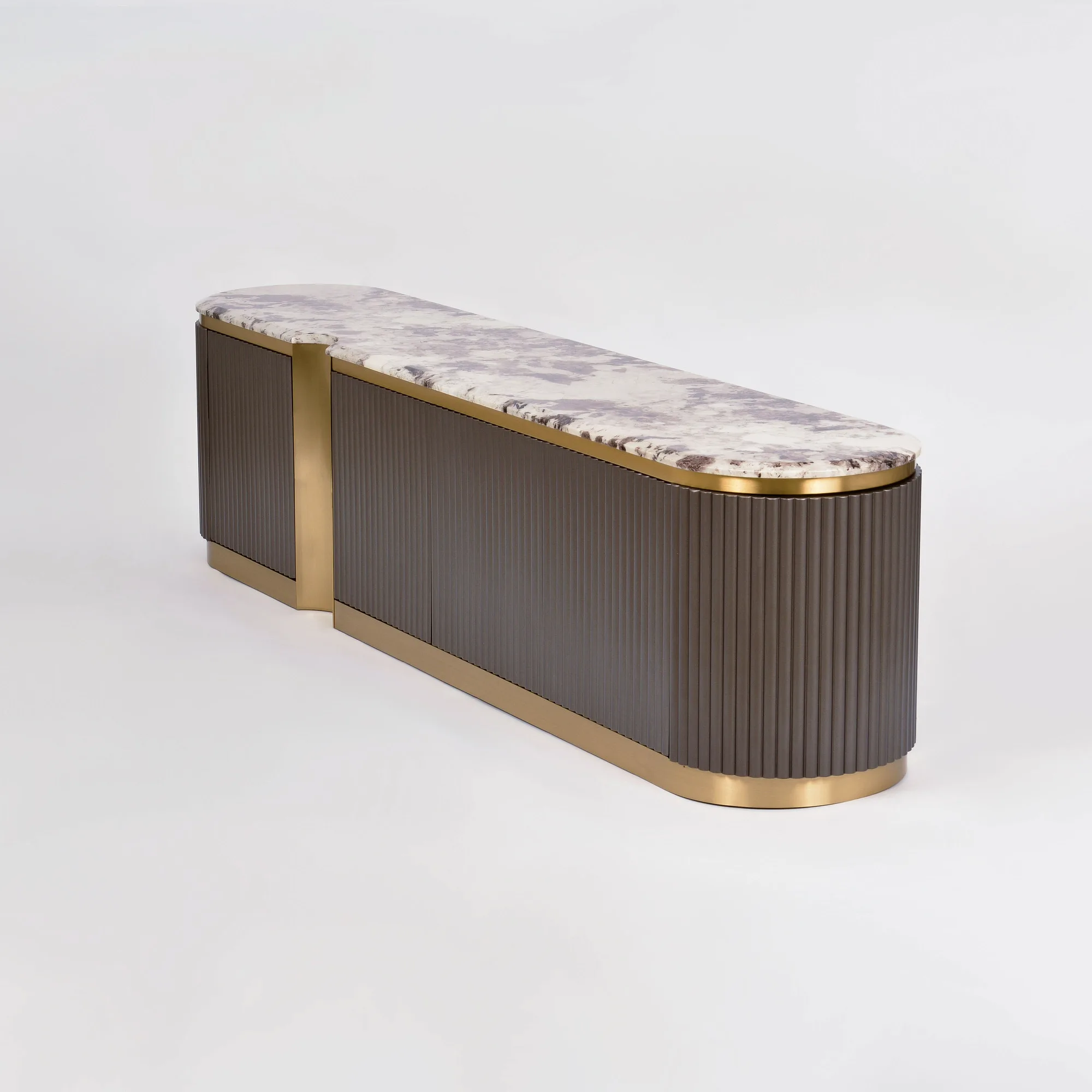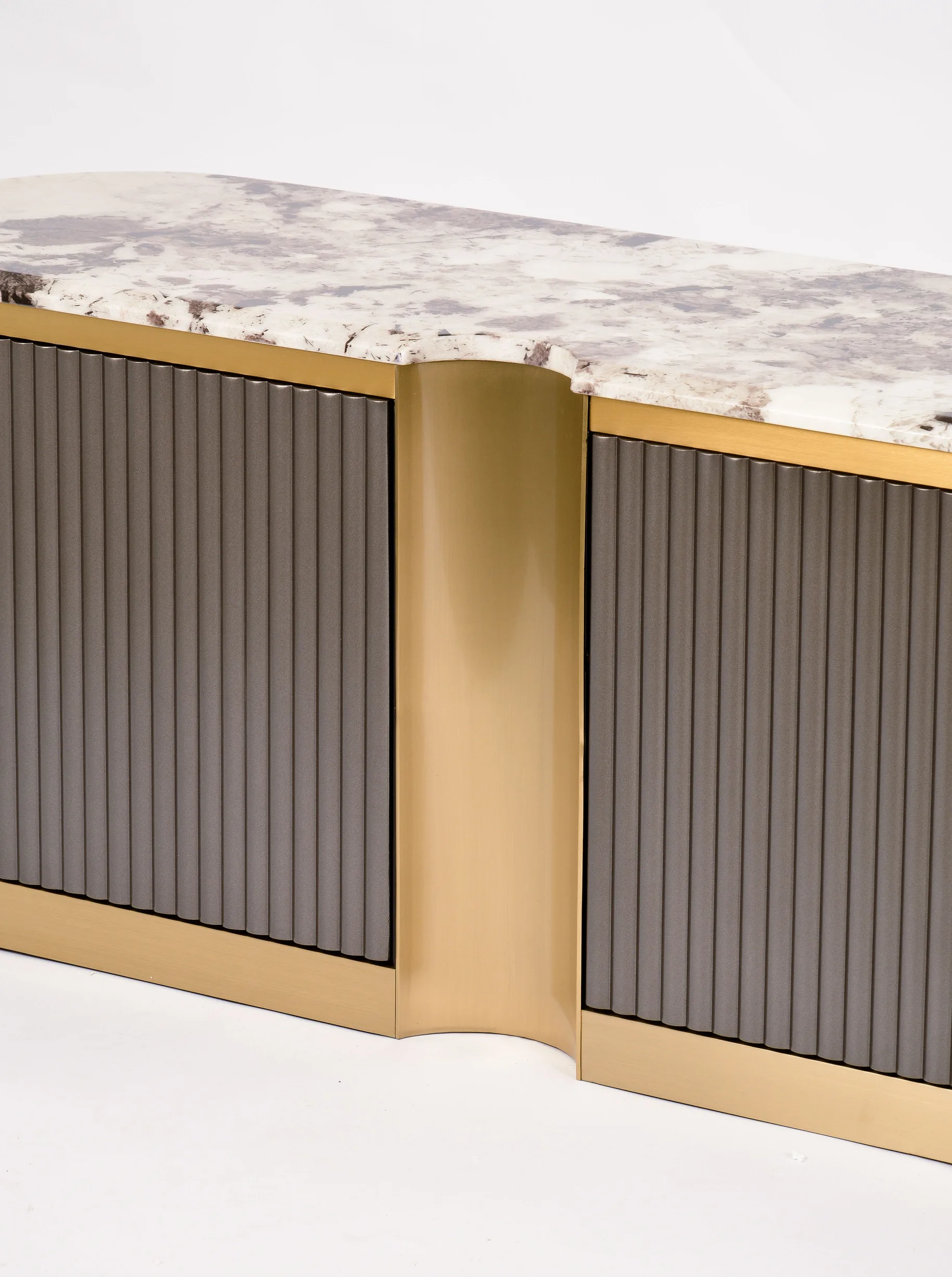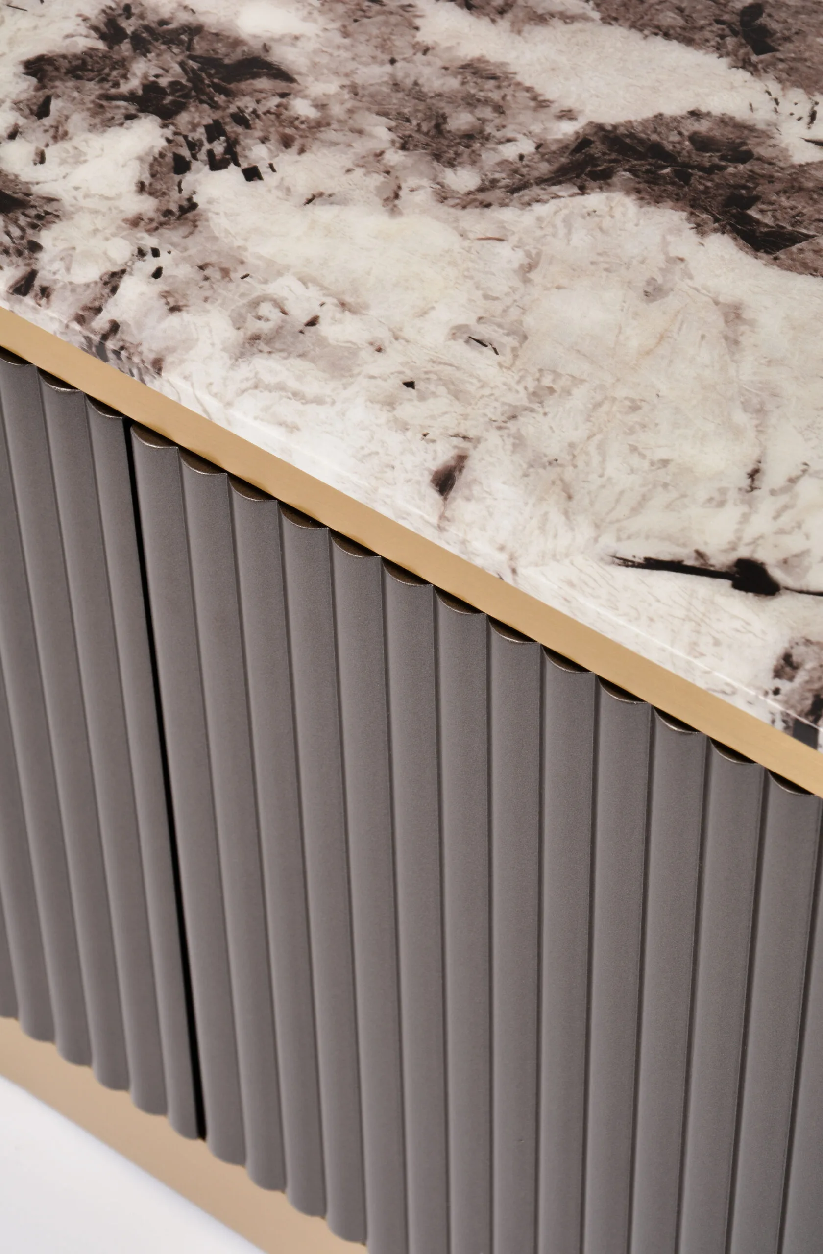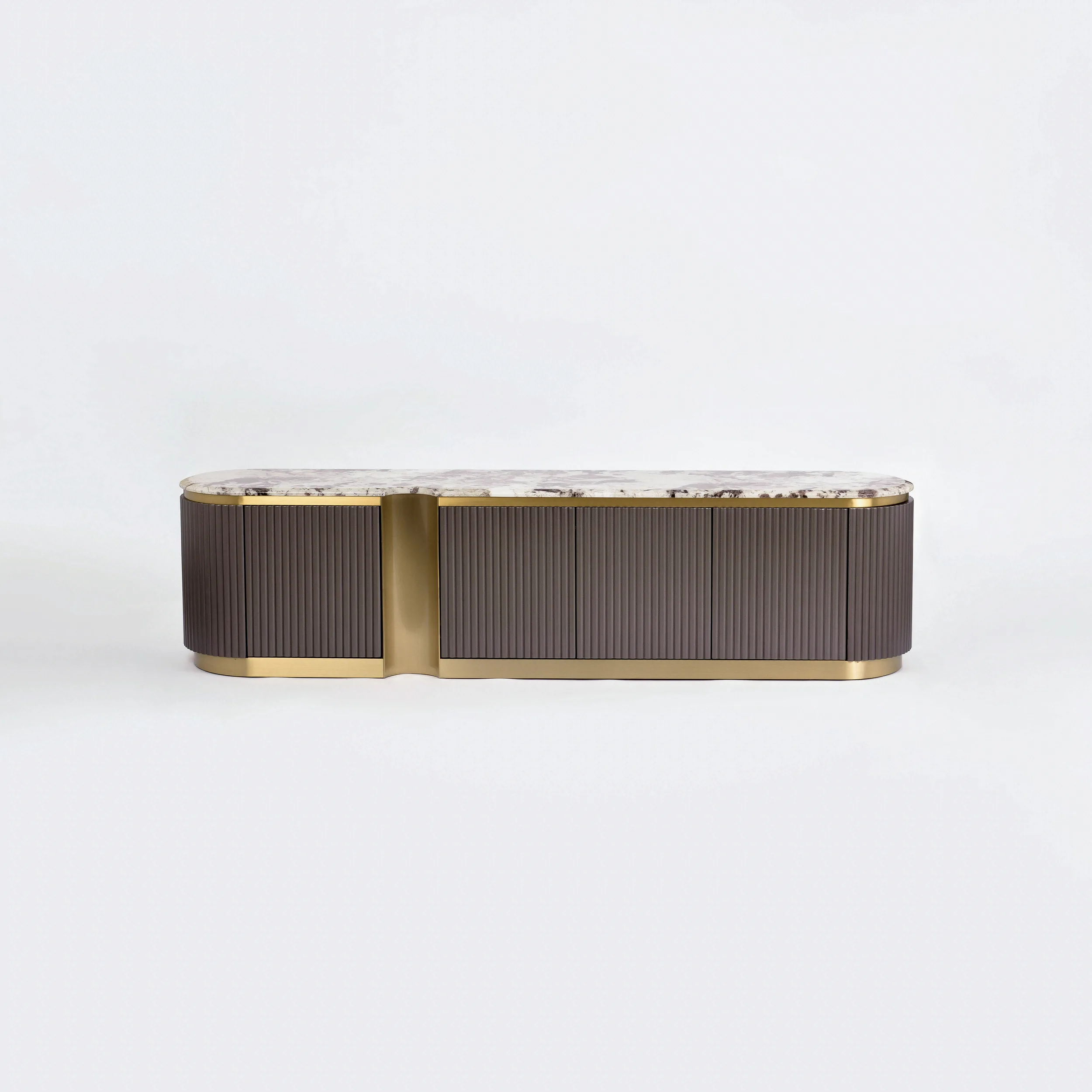 Stilig ST916 TV-alus elutuppa. See stiilne tume grafiidivärvi TV-alus kuldsete aktsentide ja alumise pärjaga lisab teie eluruumi elegantsi ja modernsust. Korpuse sooneline puit ja marmorviimistlusega töötasapind loovad luksusliku ja ajatu ilme.