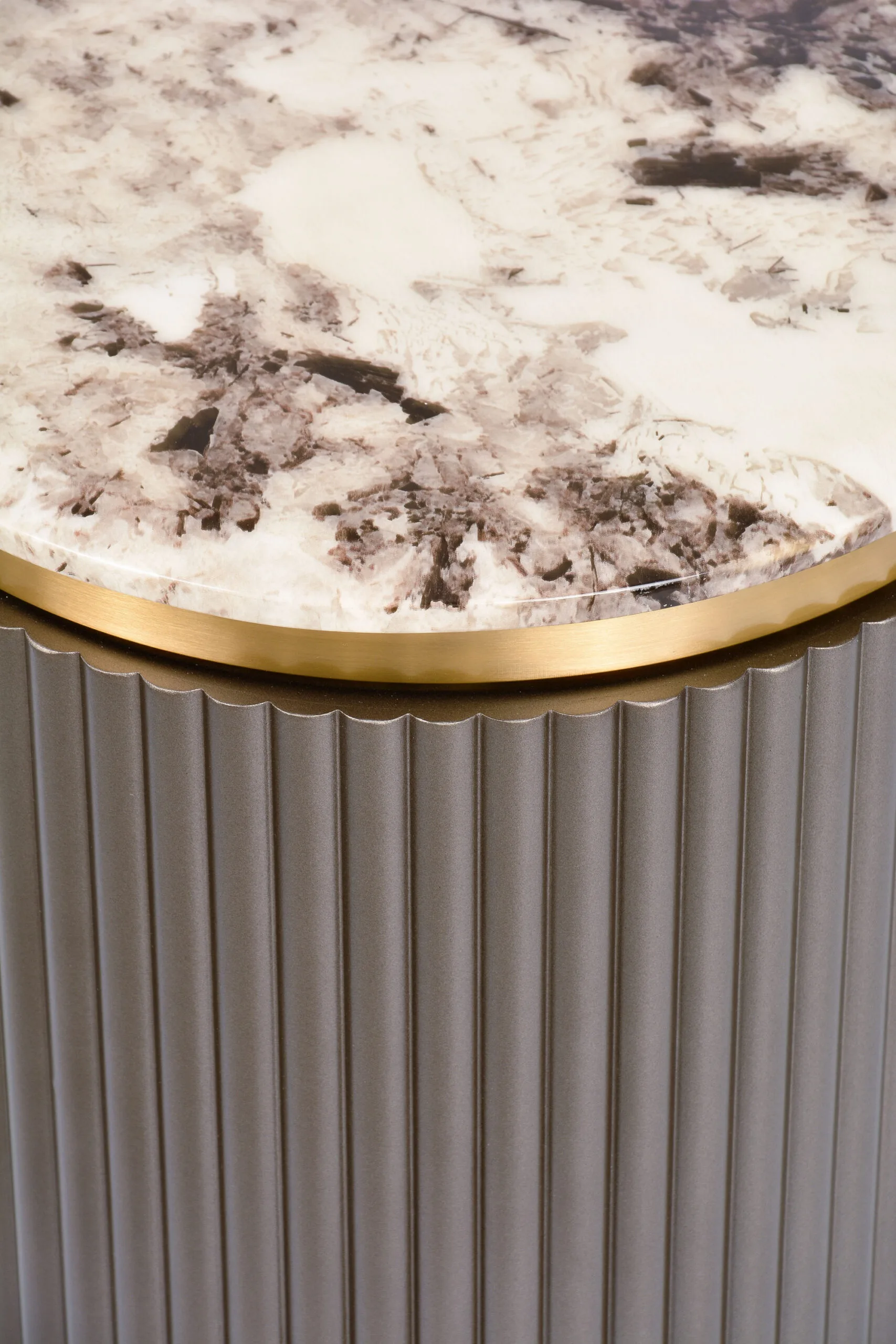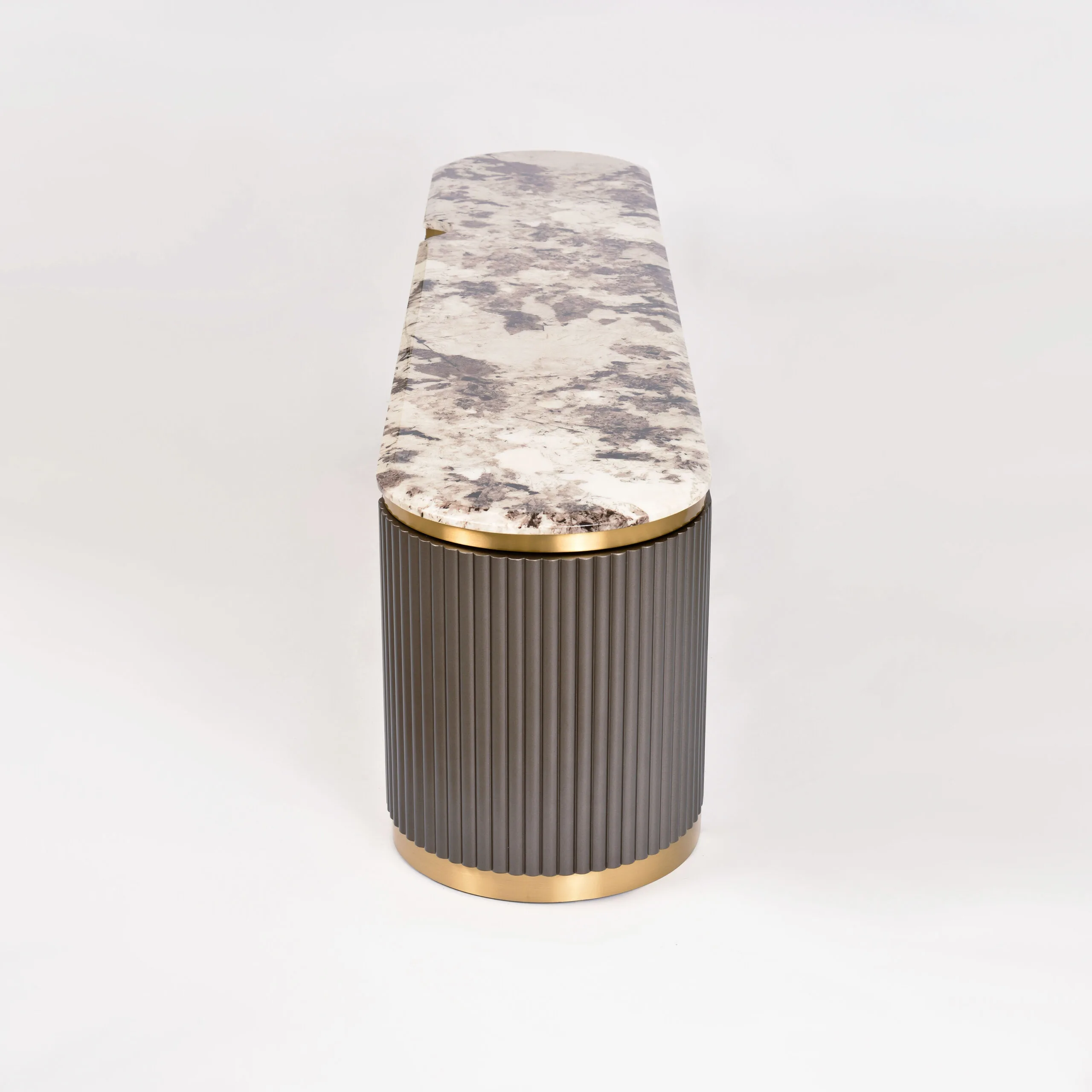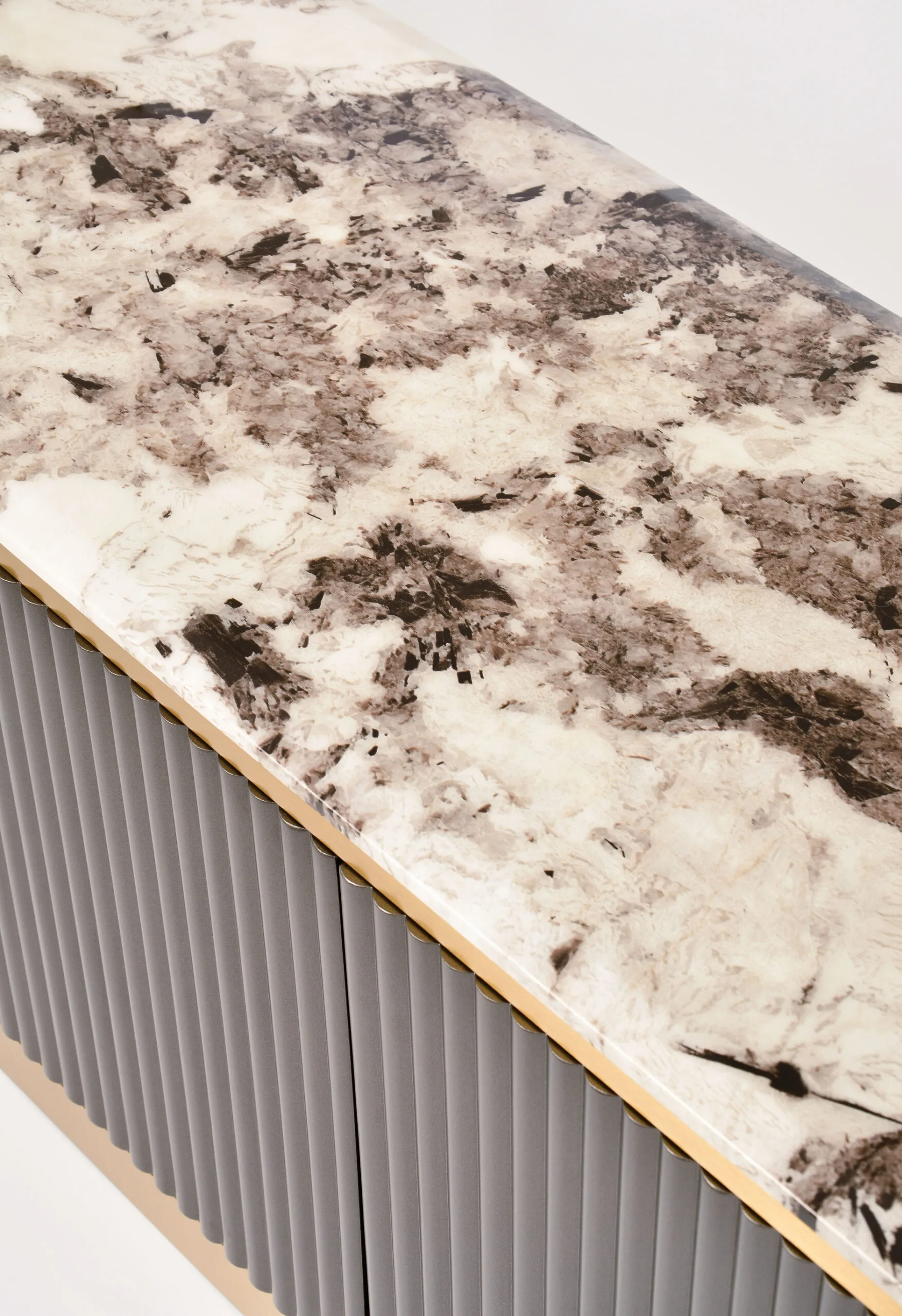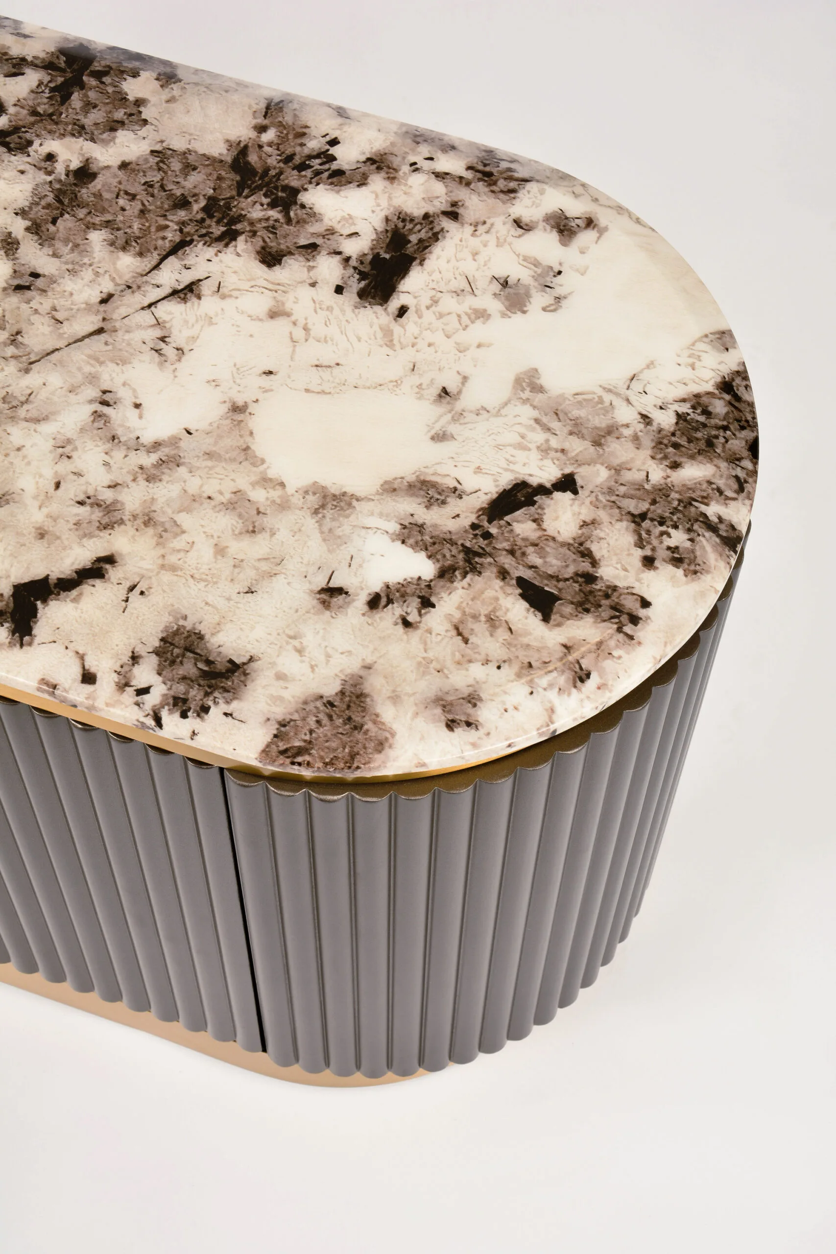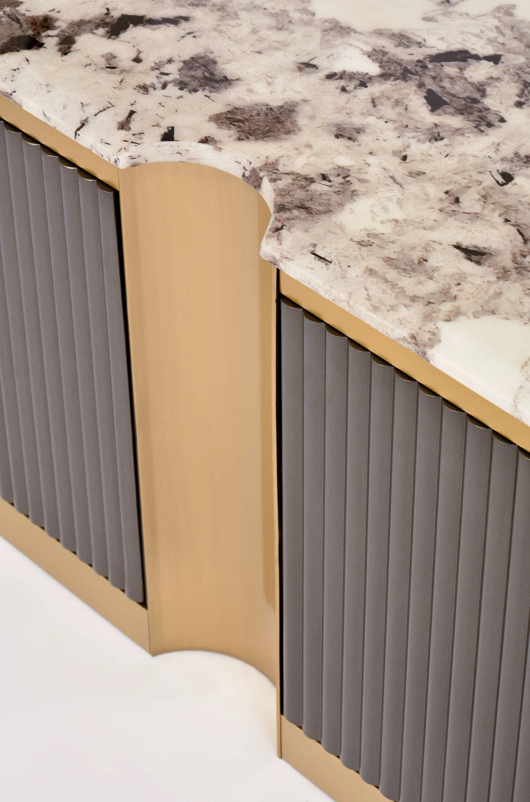 Stilig ST916 TV-alus elutuppa. See stiilne tume grafiidivärvi TV-alus kuldsete aktsentide ja alumise pärjaga lisab teie eluruumi elegantsi ja modernsust. Korpuse sooneline puit ja marmorviimistlusega töötasapind loovad luksusliku ja ajatu ilme.