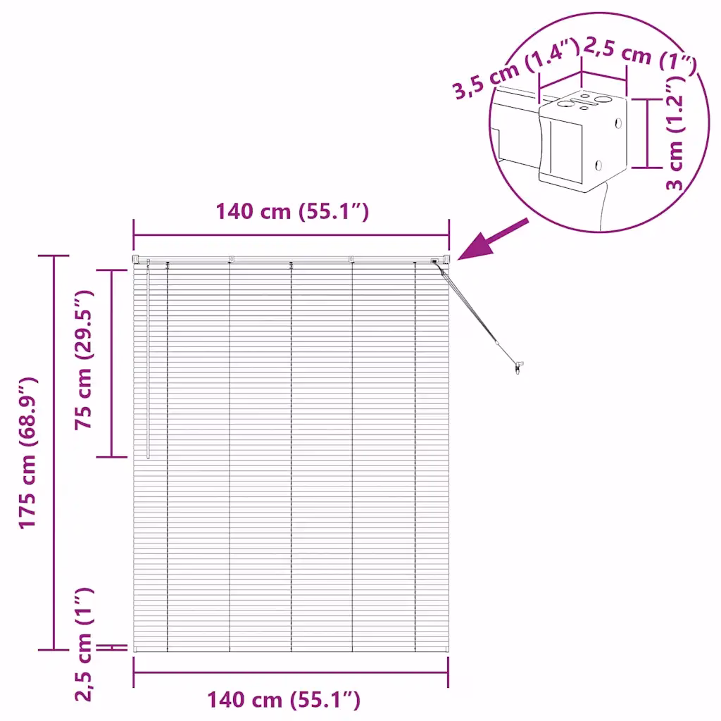 Ruloo on mõeldud paigaldamiseks akna raami sisse. Enne paigaldamist mõõda aknaava, et veenduda, kas 175 x 140 cm ruloo sobib avasse. Kinnita kaasasolevad kinnitusdetailid aknaraami ülaossa, riputa ruloo kronsteinidele ning kontrolli, et mehhanism liigub vabalt. Seejärel suuna tõmblõng läbi ohutusklambri ja kinnita see seinale, et nöör ei jääks vabalt rippuma. Ruloo avamiseks, sulgemiseks ja ribade kallutamiseks kasuta käsitsi juhitavat tõmblõnga ning külglatti.