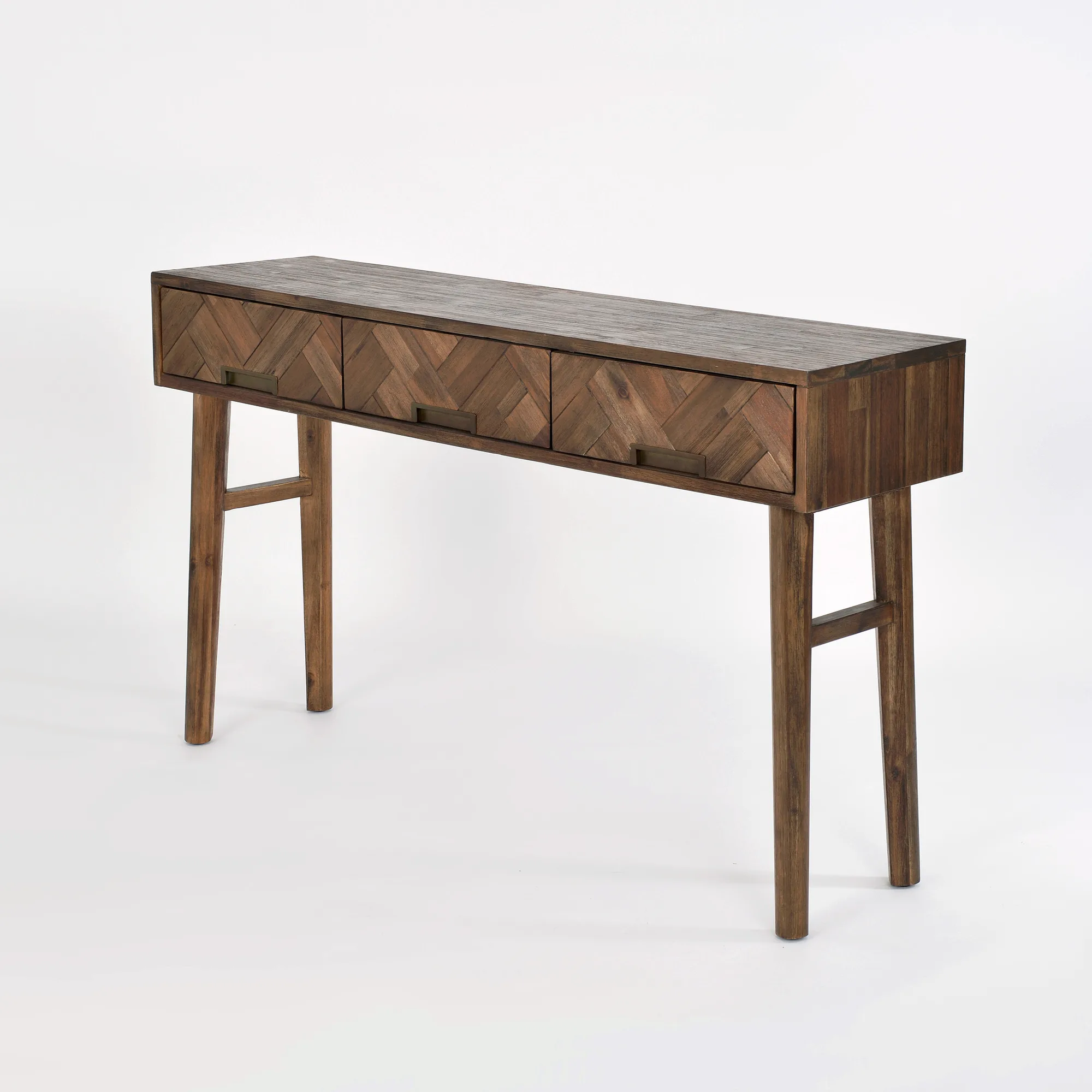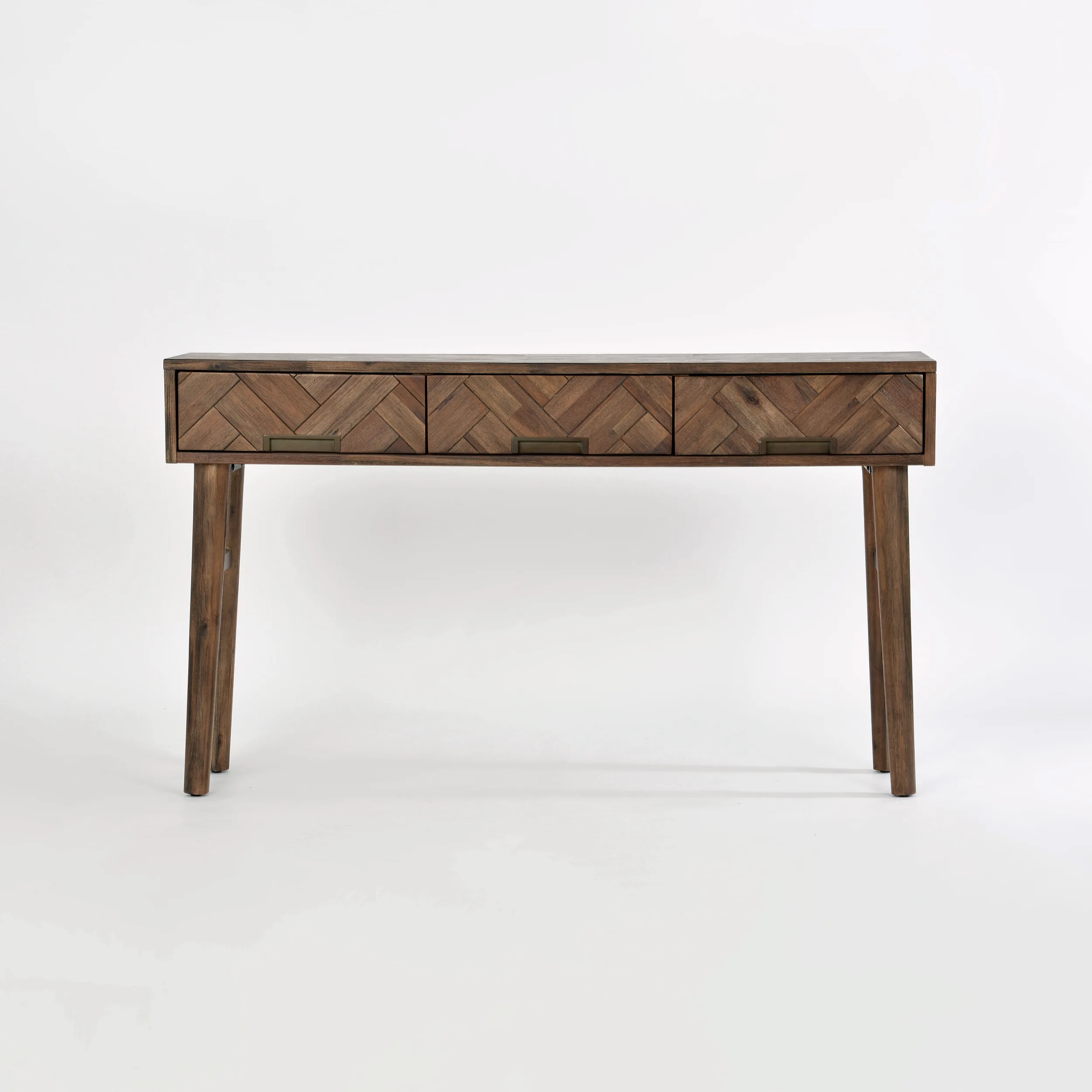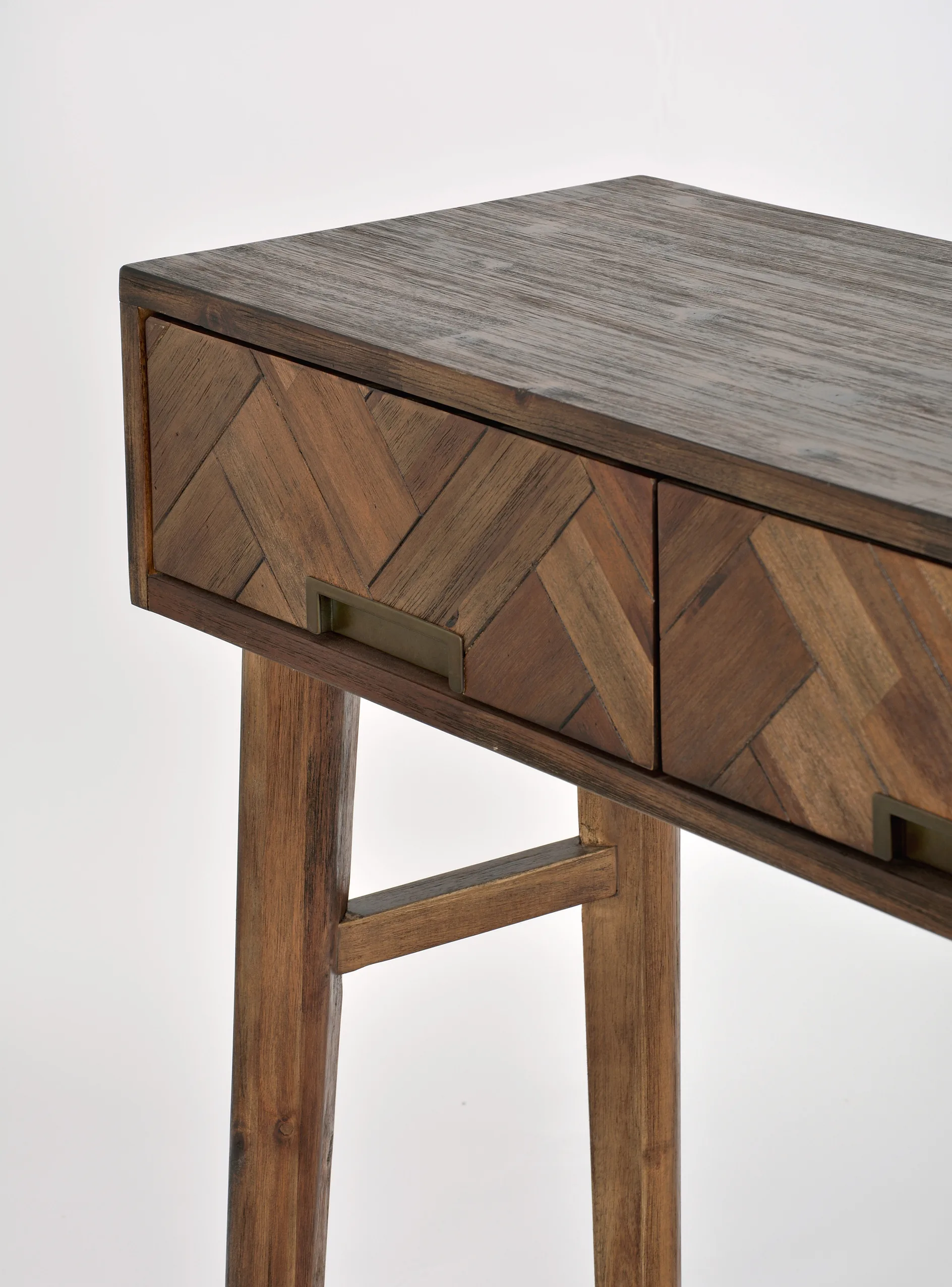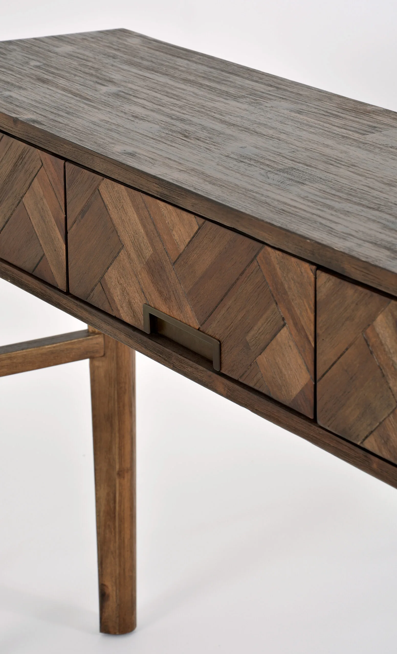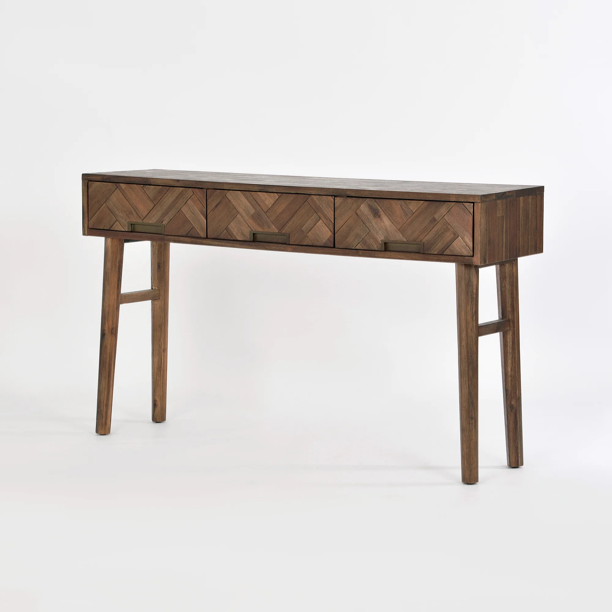 Ashton ASTL08 konsoollaud esikusse. Ashton kollektsiooni kuuluv stiilne konsoollaud on valmistatud tugevast harjatud akaatsiapuidust, mille disainis on ühendatud retro, vintage ja boho stiil. Kaunis tumepruun toon koos messingivärvi käepidemetega lisab ruumile iseloomu ja elegantsi. Täispuidust konsoollaud on varustatud kolme sahtliga, mille esipaneelidel on kalasabamustriline intarsia. Laual on tugevad puidust jalad, mis tagavad stabiilsuse ja vastupidavuse.