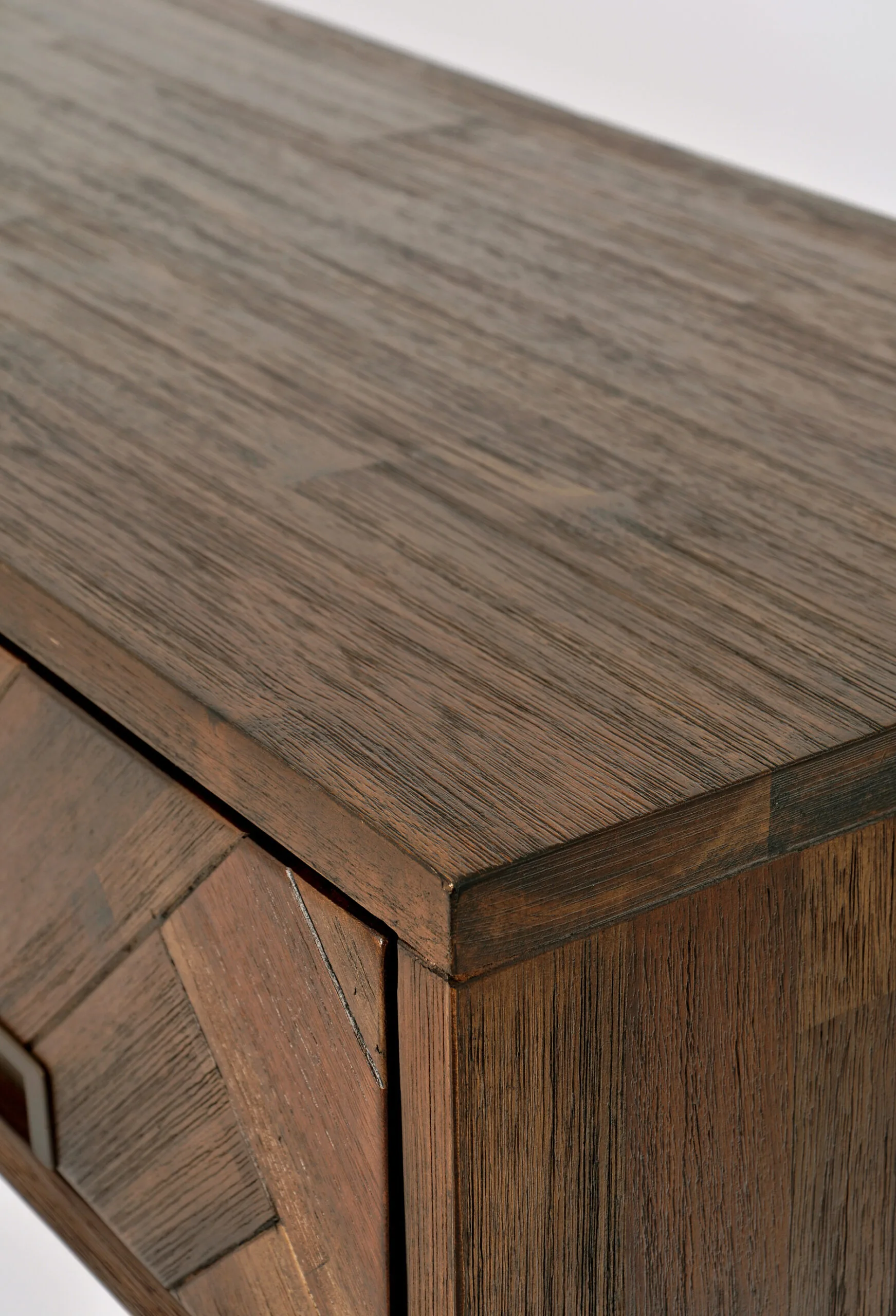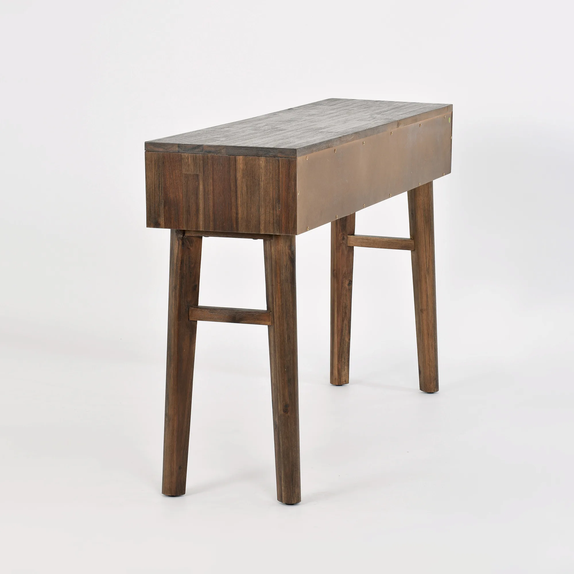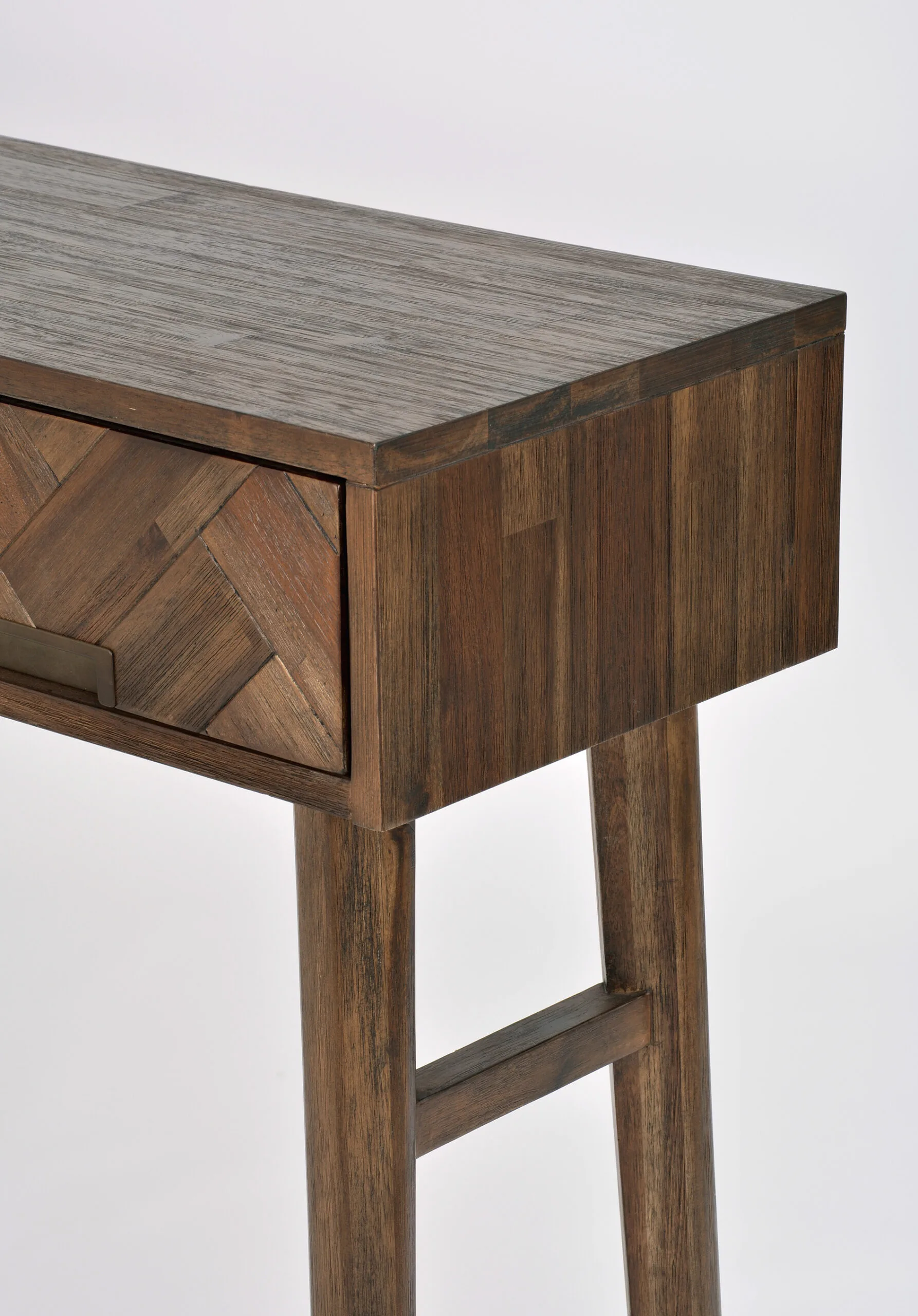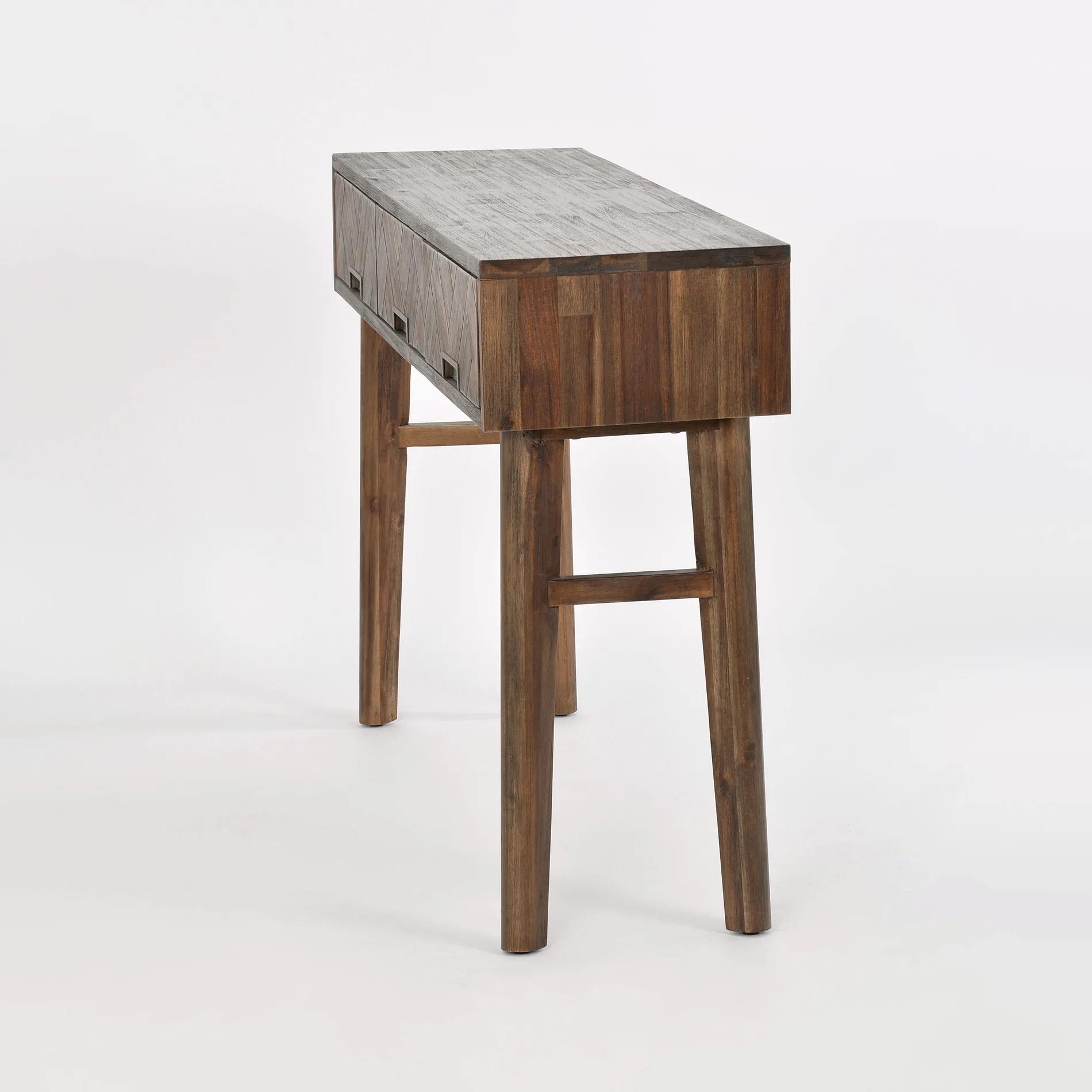 Ashton ASTL08 konsoollaud esikusse. Ashton kollektsiooni kuuluv stiilne konsoollaud on valmistatud tugevast harjatud akaatsiapuidust, mille disainis on ühendatud retro, vintage ja boho stiil. Kaunis tumepruun toon koos messingivärvi käepidemetega lisab ruumile iseloomu ja elegantsi. Täispuidust konsoollaud on varustatud kolme sahtliga, mille esipaneelidel on kalasabamustriline intarsia. Laual on tugevad puidust jalad, mis tagavad stabiilsuse ja vastupidavuse.