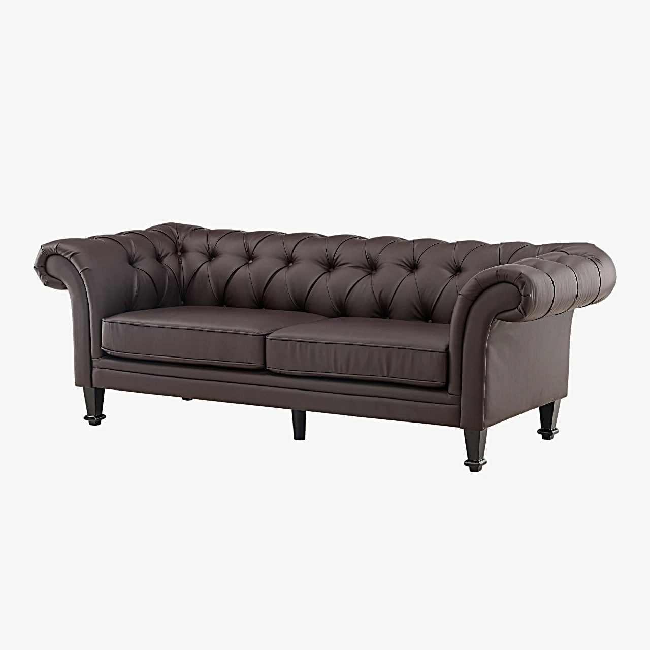 - Stiilsed detailid ja vastupidav ehitus: Kaarduvad käetoed ning väljapeetud tepinguõmblused rõhutavad tumepruuni kunstnahast diivani klassikalist joont. Mustad kummipuu jalad annavad jõulise üldmulje ning tõstavad diivani piisavalt kõrgele, et põranda hooldus oleks mugav.