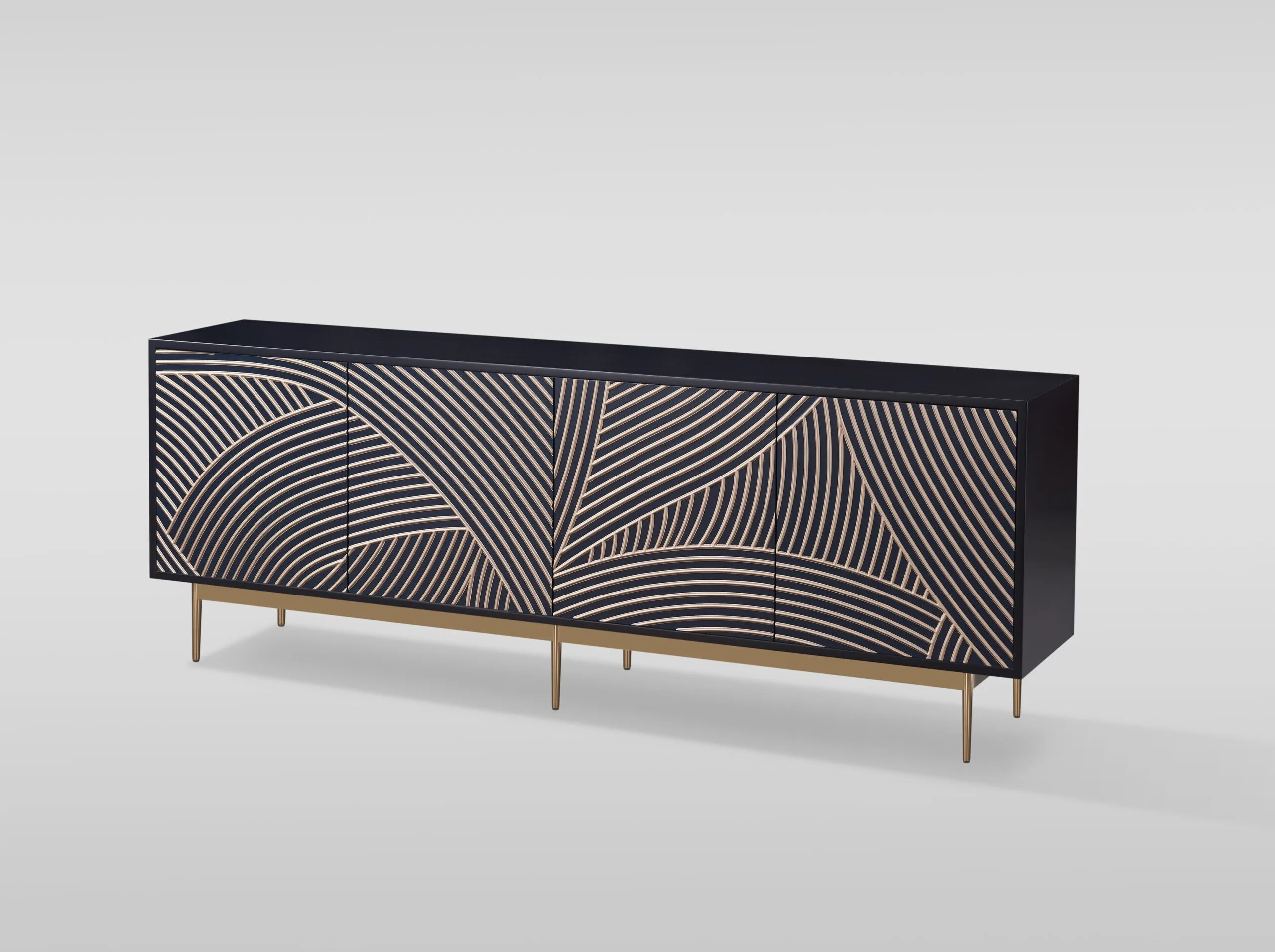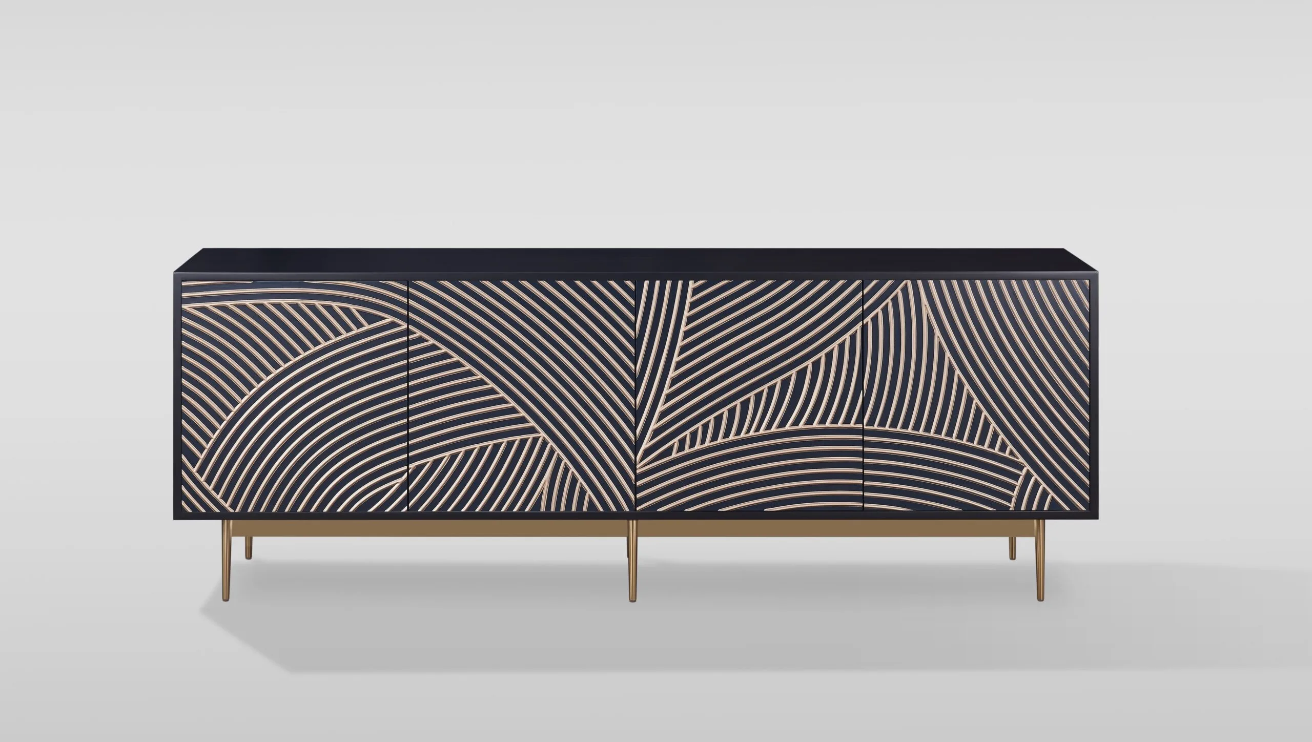 Stilig ST316 TV-kapp elutuppa. See stiilne tumesinine TV-kapp on elegantne lisa igasse elutuppa. Kapi esikülge kaunistab kuldne, kumer muster, mis on kujundatud õrnade joontega, ning kuldsed jalad lisavad sellele luksuslikku ilmet. Kapi sujuv ja ühtlane korpus loob täiusliku kontrasti kaunistatud esiküljega.