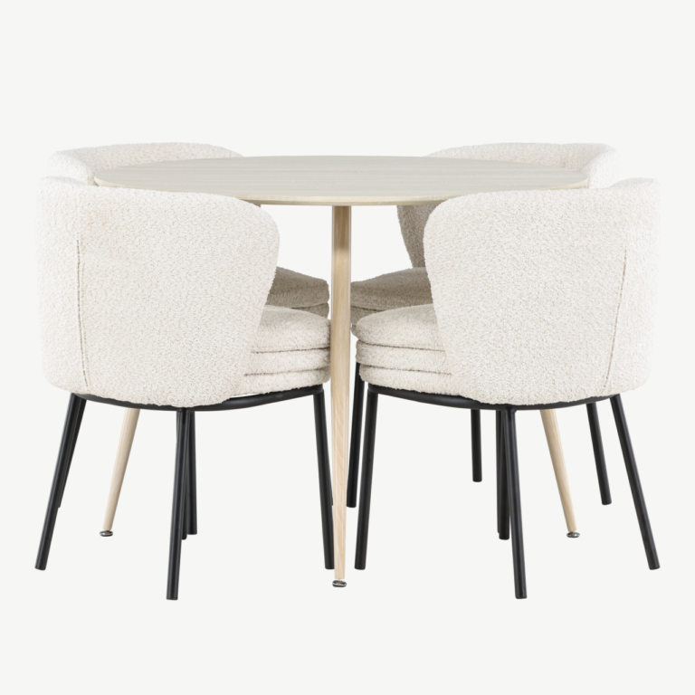 Kui soovite oma koju tuua põhjamaiselt helge ja mugava atmosfääri, on valge ümar söögilauakomplekt Plaza 4 Agnes bukleekattega tooliga ideaalne valik. See kaasaegne mööblikomplekt ühendab heledad toonid, kvaliteetsed materjalid ja läbimõeldud disaini, et muuta igapäevased söögikorrad veelgi meeldivamaks.