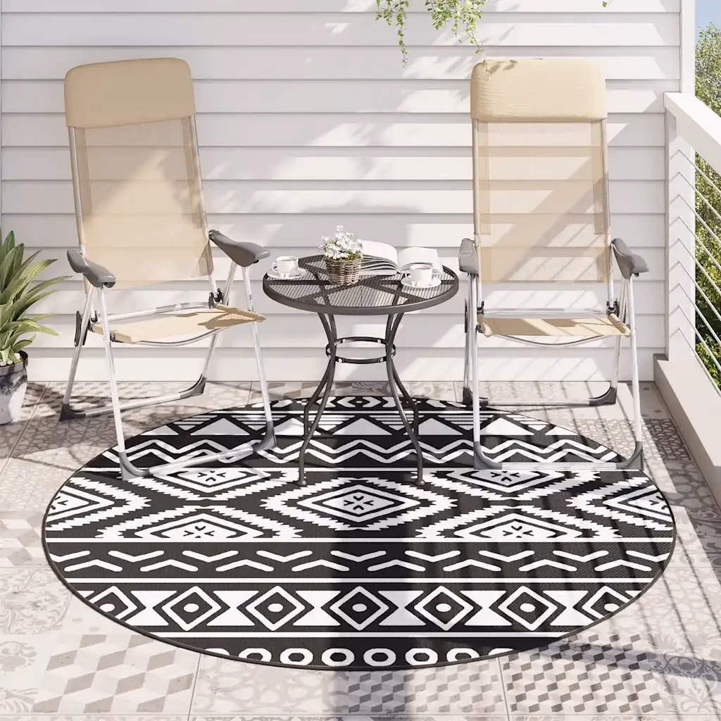 Ümmargune õuevaip ARAKIL aitab muuta terrassi, rõdu või aia puhkenurga kiiresti hubasemaks ja visuaalselt ühtsemaks. Must jacquard-muster lisab selge graafilise aktsendi ning tänu polüpropüleenist (PP) materjalile sobib vaip kasutamiseks nii sise- kui väliruumides.