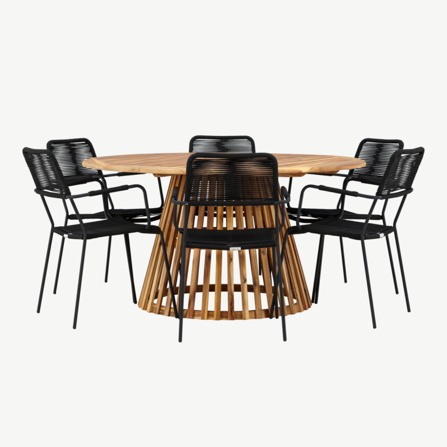 - Komplektis: ümmargune akaatsiapuidust laud & 6 Lindos tooli (alumiiniumraam, must polüesterköis)