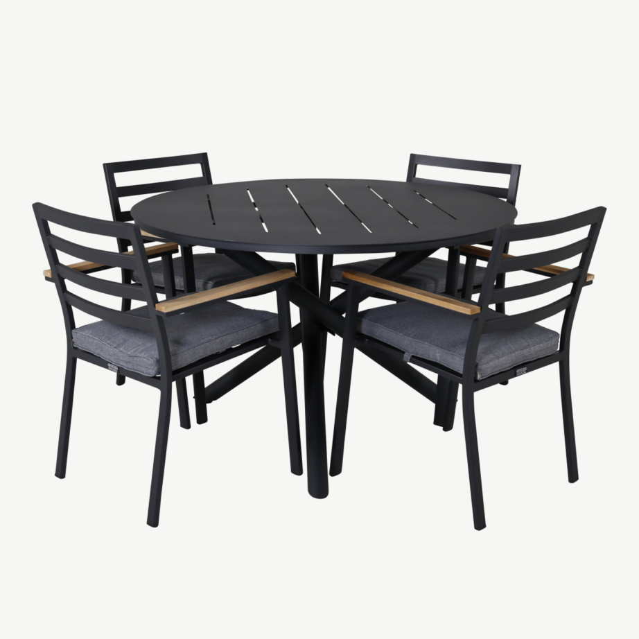 Ümmargune alumiiniumist aiamööblikomplekt Alma on ideaalne lahendus, kui hindad esteetikat, vastupidavust ja praktilisust oma väliruumis. Mustast alumiiniumist ümmargune söögilaud Alma ning sobivad Brasilia sarja toolid, mida ilmestavad elegantsed tiigipuust detailid, loovad modernse ja kauni koosluse, mis täiendab suurepäraselt põhjamaise stiiliga aeda, terrassi või rõdu.