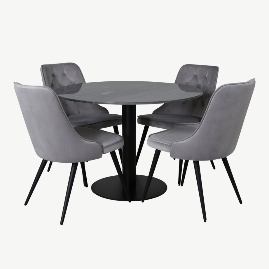 Ümmargune laud loob sõbraliku, ruumisäästliku lahenduse, mis võimaldab neljal inimesel mugavalt istuda. Tumehall marmor ja mustad detailid rõhutavad põhjamaist modernsust ning toovad ruumi iseloomu. Helehallid sametist toolid lisavad interjöörile nii hubasust kui ka elegantsi ning on lihtsad hooldada.