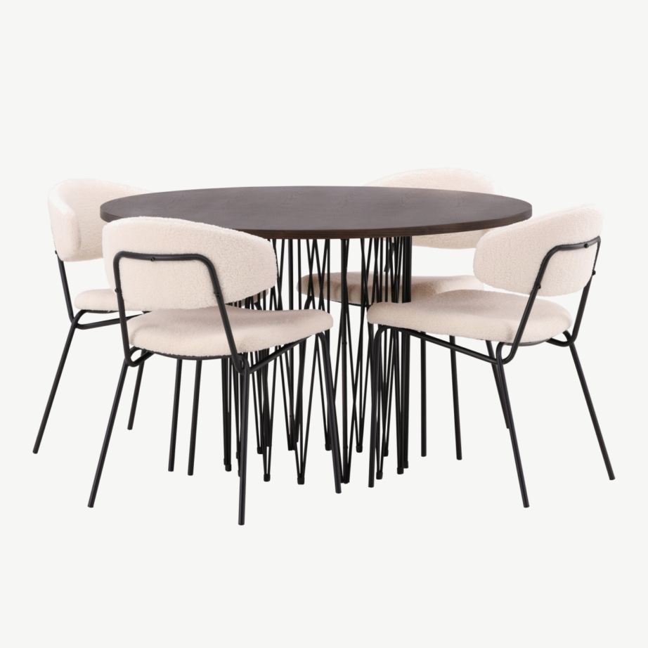 Stone ümmarguse söögilaua tume mokkatoon ja must metallraam moodustavad elegantse ja moodsalt kontrastse koosluse. Minimalistlikud Chico toolid valge bukleekattega on pilkupüüdvad ning väga mugavad – ideaalne valik ka pikemate õhtusöökide nautimiseks. Tänu põhjamaisele disainile sobib ümmargune söögilaud toolidega nii avarasse söögituppa kui hubasesse linnakorterisse.