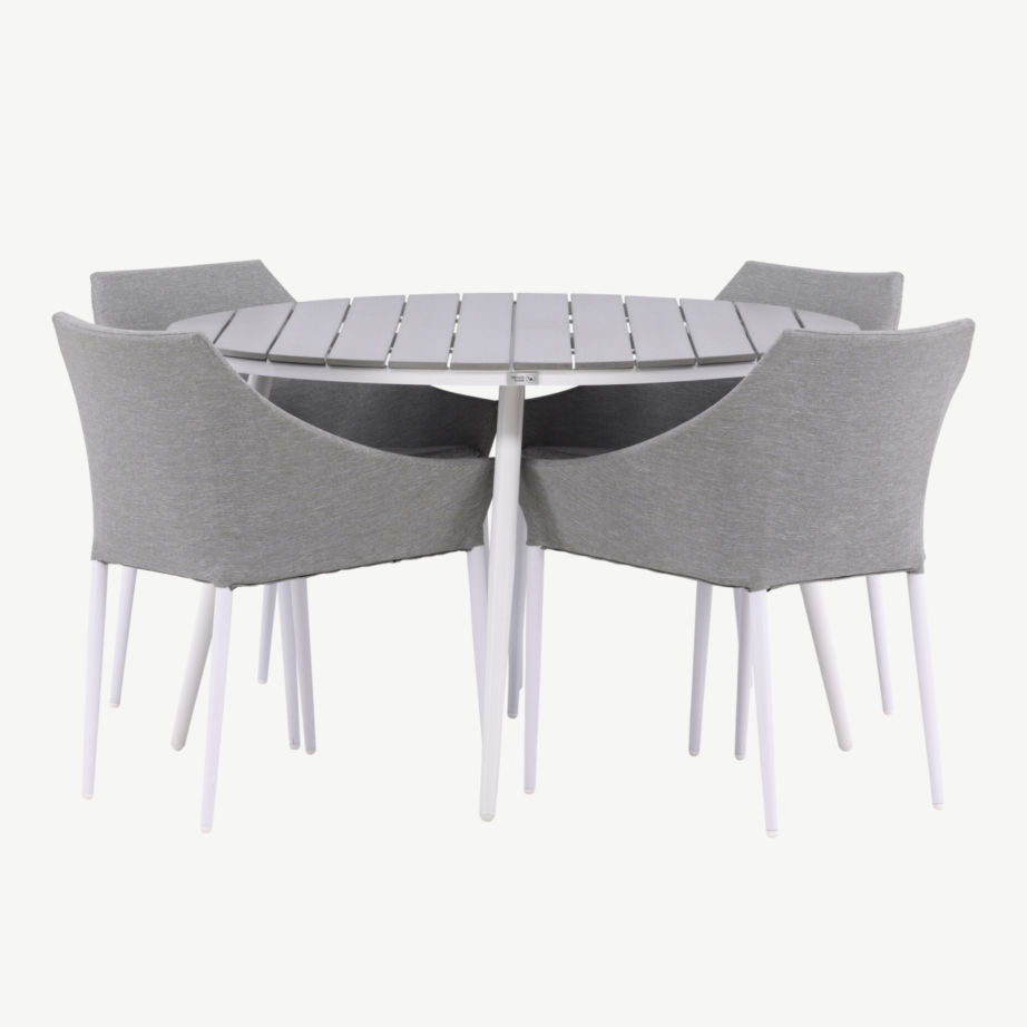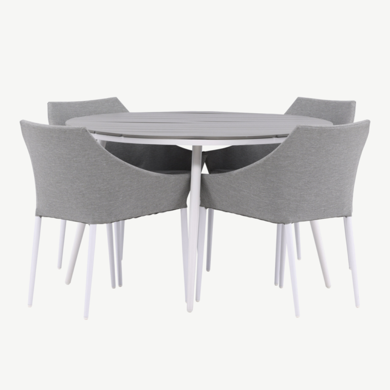 - Ümmargune lauaplaat: valmistatud vastupidavast hallist Aintwoodist – plastikmaterjalist, mis meenutab puitu, kuid ei vaja sama hoolt ning peab hästi vastu ilmastikutingimustele. Laua läbimõõt on 120 cm, pakkudes rohkelt ruumi neljale inimesele – sobib nii väikesele perele kui sõpradega ühiseks ajaveetmiseks.