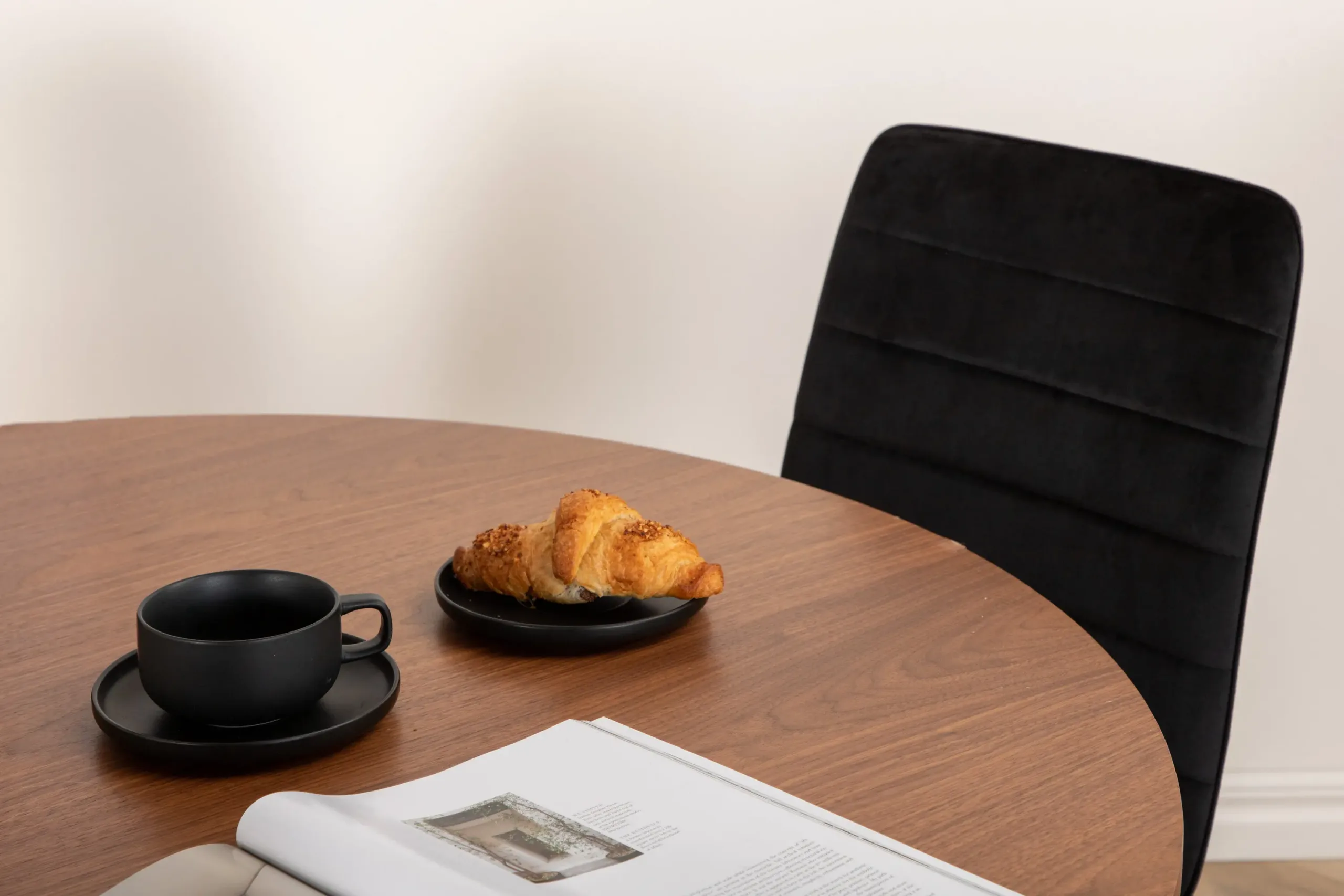 Ümmargune söögilaud komplekt ühendab kaunid pähklitoonid ning musta, luues rikkaliku ja tasakaalustatud üldmulje. Komplekt sobitub suurepäraselt põhjamaisesse stiili, täiendades nii modernseid kui klassikalisi kodusid. Kvaliteetsed materjalid ja elegantne viimistlus tagavad pikaajalise kestvuse.