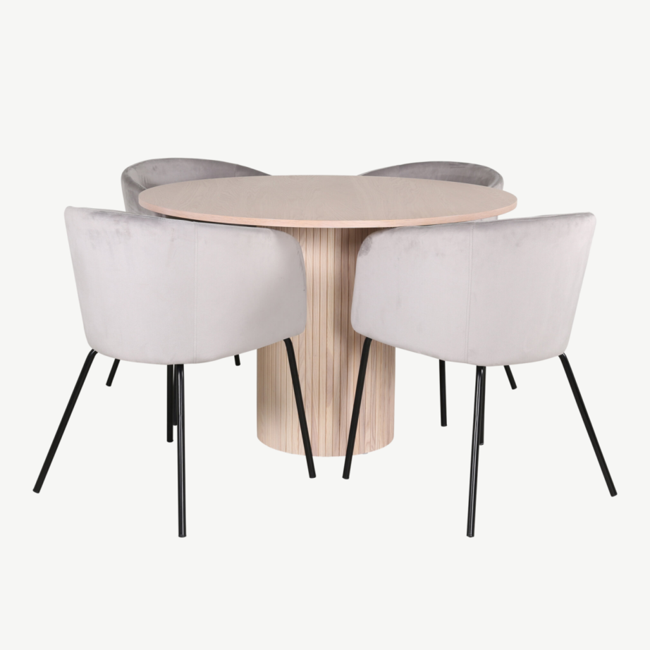 Ümmargune söögilauakomplekt sisaldab neli pehme halli sametpolstriga Berit söögitooli. Velvetkangas (80% polüester velvet, 20% polüester linane) ja ergonoomiline iste tagavad suurepärase istumismugavuse ka pikemal õhtusöögil. Mustast terasest kitsad jalad toovad toolidesse kaasaegse hõngu ning loovad harmoonilise kontrasti tooli õrnade toonidega. Iga tooli mõõtmed on 55 x 78 x 55 cm, võimaldades avarat ja toetavat istumispinda.