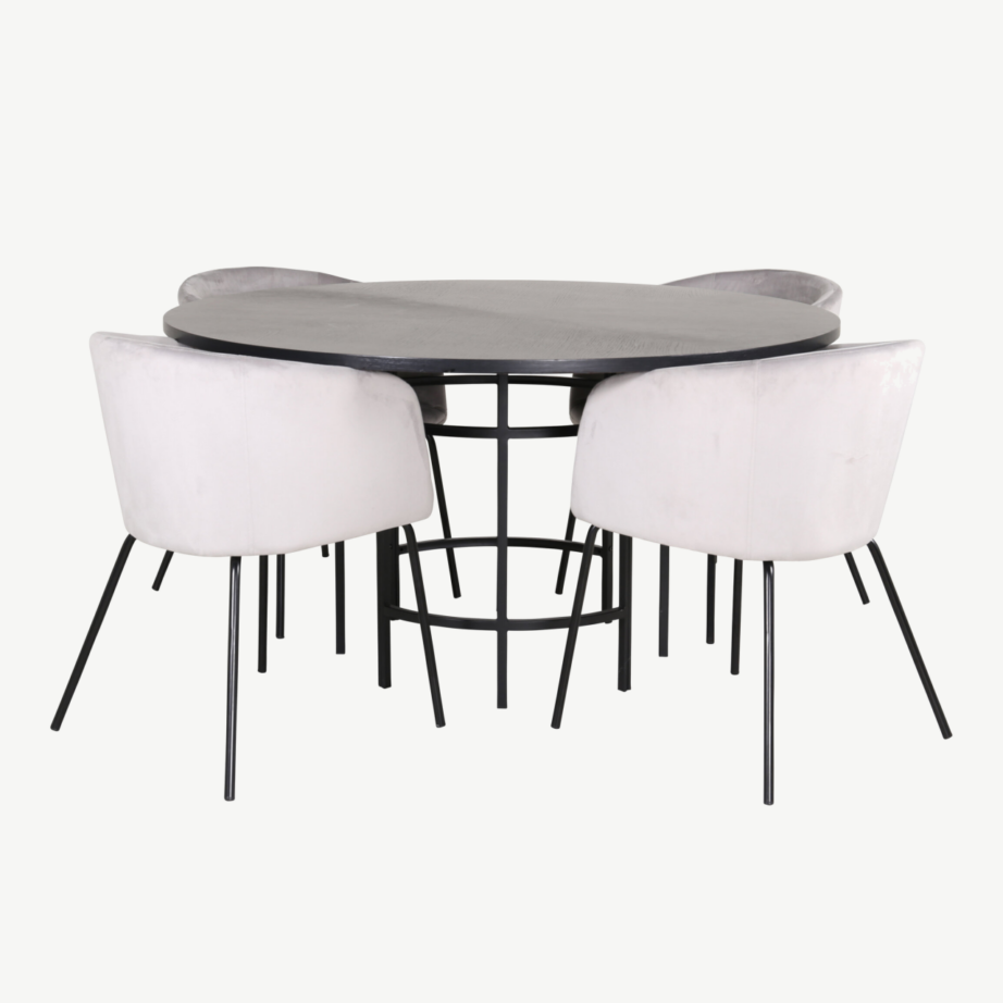 Too oma koju modernset elegantsi Copenhagen ümmarguse söögilauakomplektiga! See stiilne lahendus ühendab trendika vormi, kvaliteetsed materjalid ja eksimatult põhjamaise koloriidi. Ajatu must ümmargune laud ja heledad sametist toolid loovad hubase ning kutsuva keskkonna, mis sobib nii igapäevaste pereõhtusöökideks kui ka pidulikeks sündmusteks.