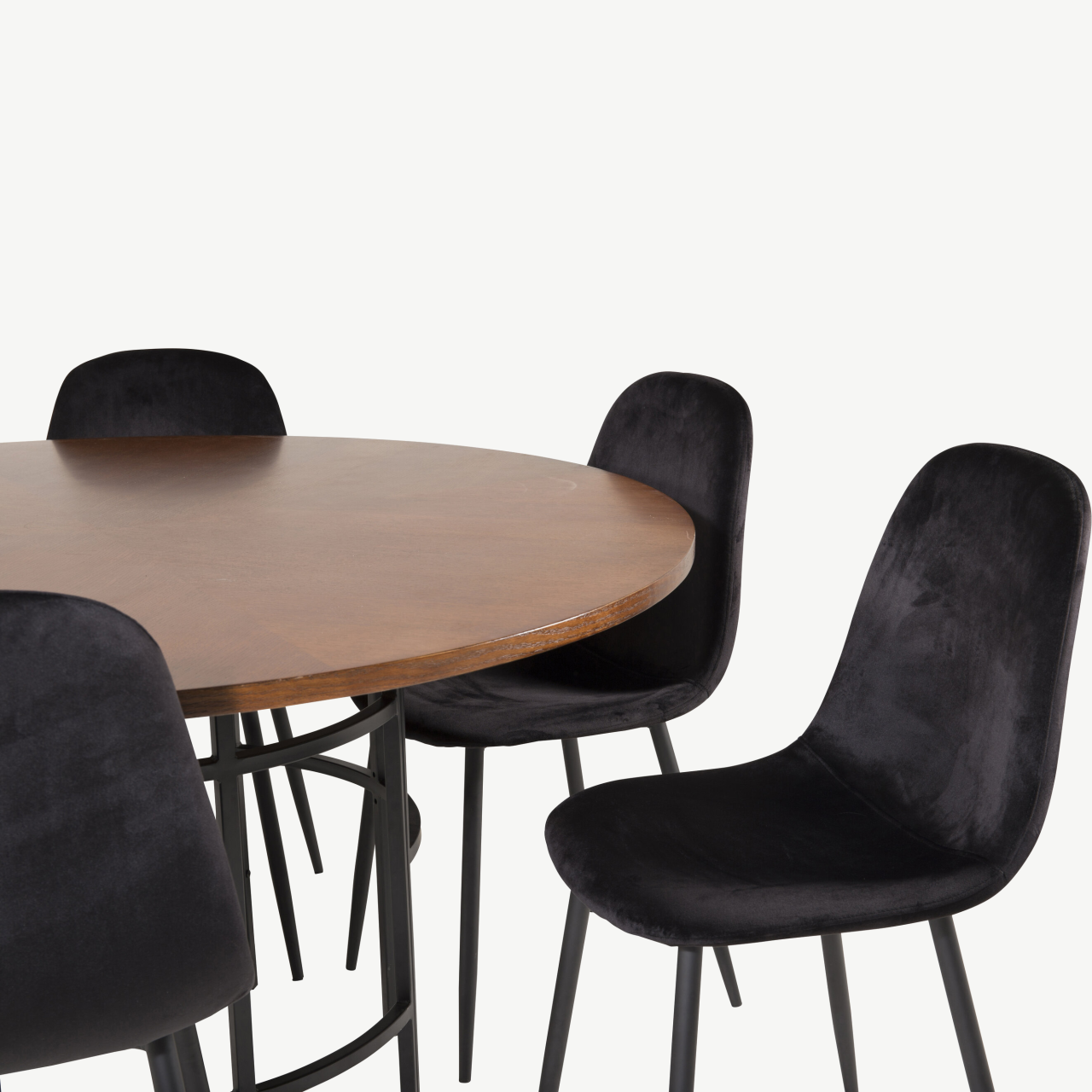 Ümmargune söögilauakomplekt Copenhagen ühendab klassikalise stiili, kvaliteetsed materjalid ja ajatu disaini, sobitudes suurepäraselt põhjamaise interjööriga. Komplekti kuulub ümmargune pruun lauaplaat ning kuus elegantset musta velvetkattega Polar söögitooli. See kooslus loob ruumi sooja ja kutsuva atmosfääri – igapäevased toidukorrad muutuvad nauditavaks sündmuseks.