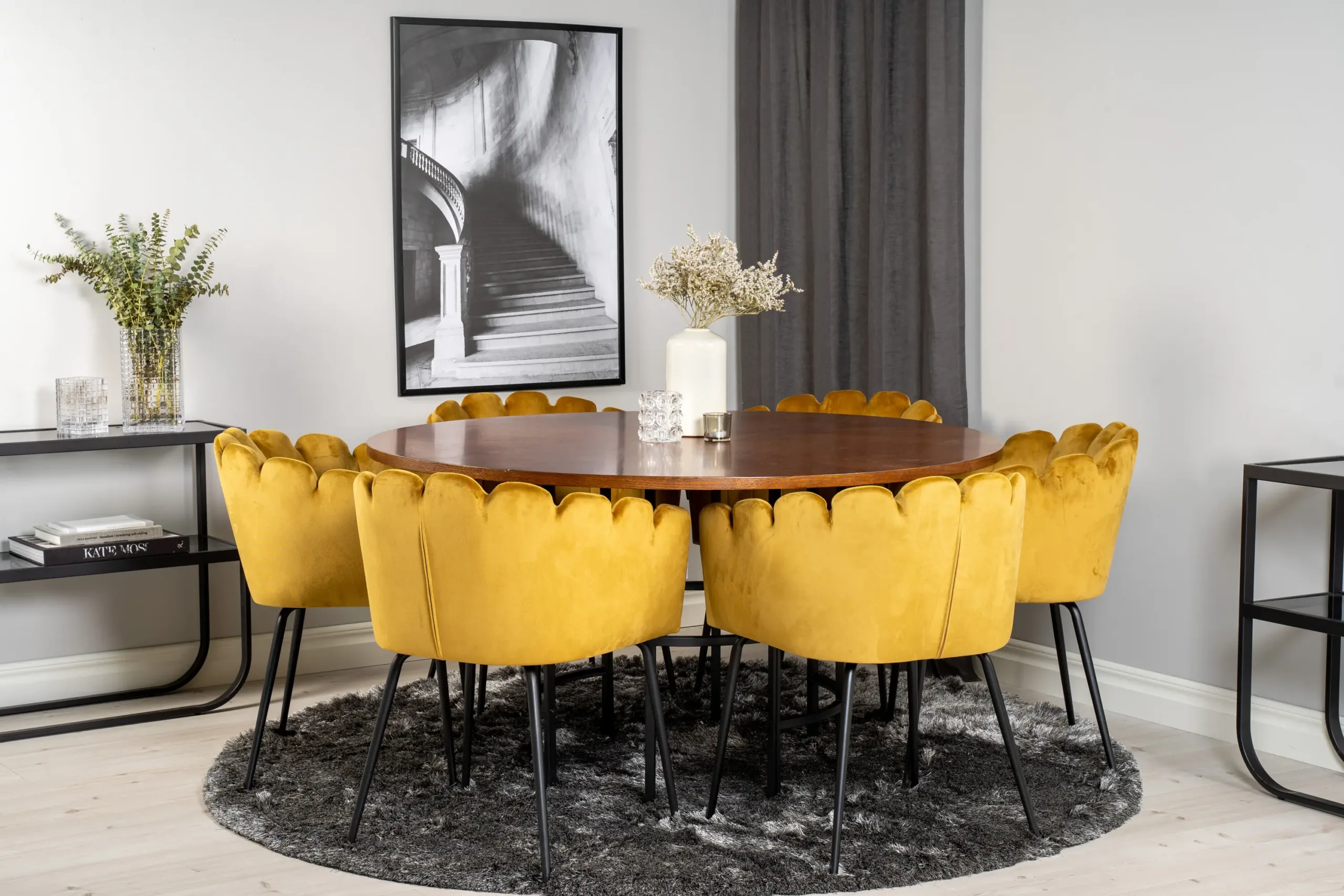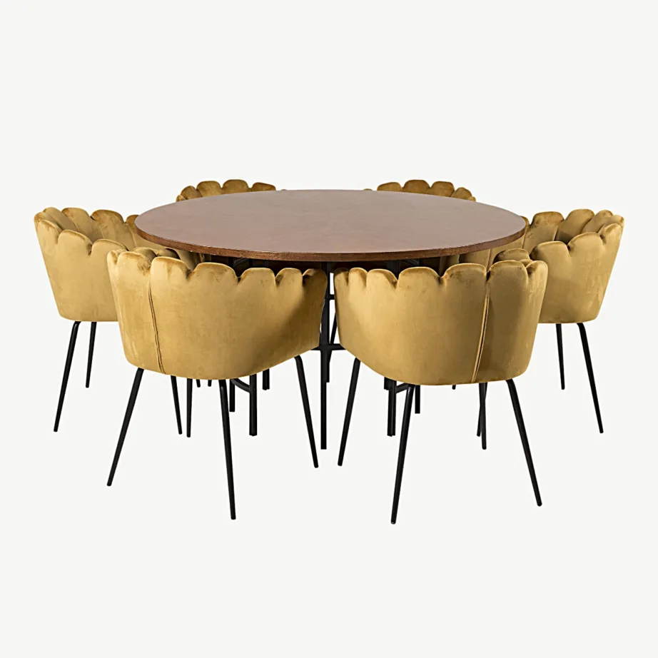 Ümmargune söögilauakomplekt samettoolidega ühendab tumeda, looduslähedase puidumustri erksa ja eksklusiivse sametkangaga. Ümarad vormid peegeldavad põhjamaist esteetikat ning sobivad nii avarasse lofti kui hubasesse pereelutuppa.