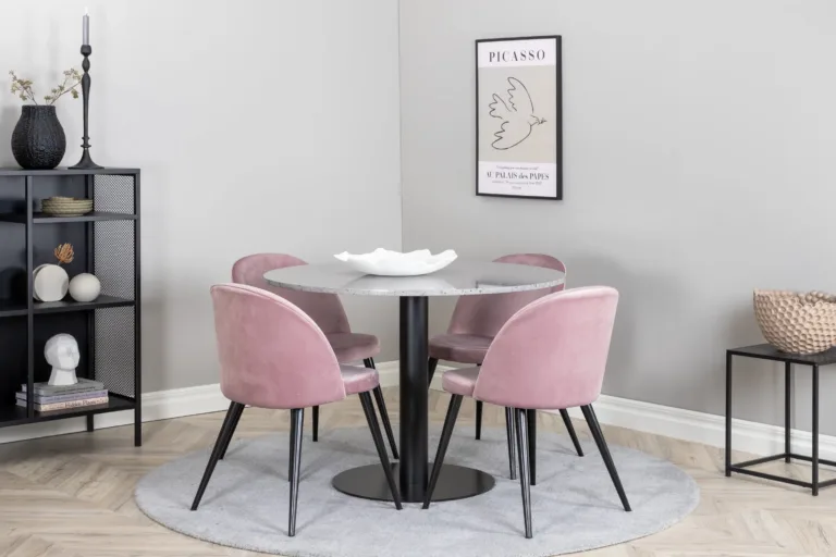 Värskenda oma kodu südant põhjamaise disaini ja ajatult moodsate värvitoonidega. Razzia ümmargune söögilauakomplekt ühendab endas kvaliteetse hallist terazzost laua ning elegantsed tolmuroosast sametist toolid, pakkudes ruumile nii hubasust kui ka stiilipuhtust. See ümmargune söögilauakomplekt on ideaalne valik nii kaasaegsesse kui ka klassikalisse koju ja sobib ideaalselt peresöögikordadeks või külaliste võõrustamiseks.