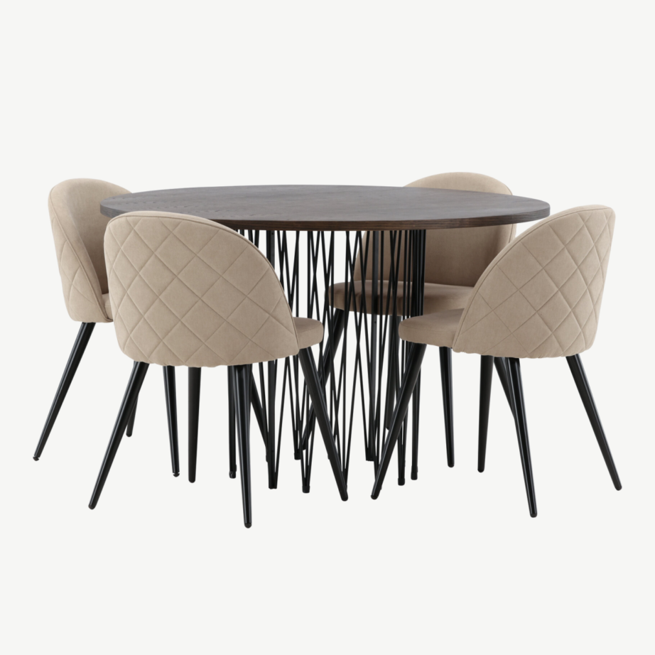 - Komplektis: ümmargune söögilaud ja neli polsterdatud söögitooli