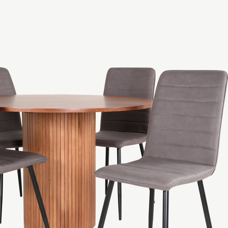Bianca ümmargune söögilauakomplekt pähkliga, kuhu kuulub elegantne pähklivineeriga söögilaud ning neli Windu halli mikrofiibrist tooli mustade metallist jalgadega, pakub põhjamaise disaini armastajale ideaalset lahendust. Komplekt ühendab endas stiili, funktsionaalsust ja vastupidavust, muutes söögitoa pilkupüüdvaks keskpunktiks.