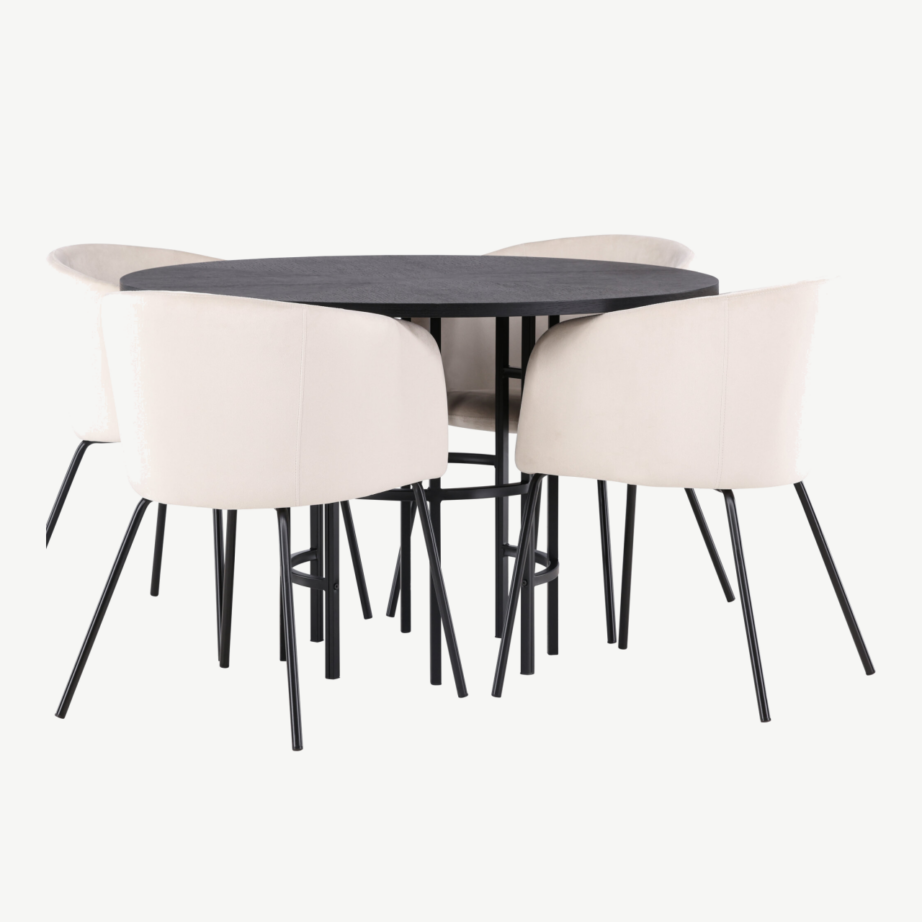 Minimalistlik must söögilaud ja õhulised beežist velvetkangast toolid loovad täiusliku harmoonia igasse koju. Ümmargune laud soodustab meeldivaid ühiseid hetki – selle ümber mahuvad mugavalt pere ja sõbrad. Berit söögitoolide täispolsterdus ning ümar vorm pakub erakordset istumismugavust, lisades igale ruumile hubasust ja soojust.