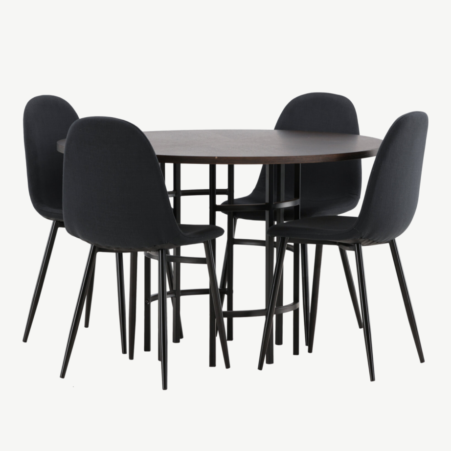 - Komplekt sisaldab: 1 ümmargune söögilaud ja 4 tooli