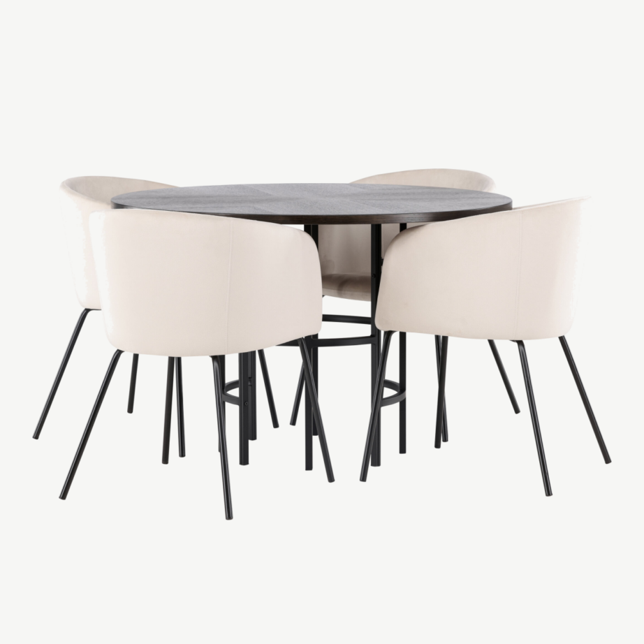 See ümmargune söögilaud toolidega loob ruumis kutsuva atmosfääri ning väärtustab igat toidukorda. MDF-vineerist lauaplaat on vastupidav ja kergesti hooldatav, tagades pikaealisuse. Täispolsterdatud toolid teevad istumise mõnusaks ka pikkade õhtusöökide ajal ning mustad metalljalad annavad modernse kontrasti.