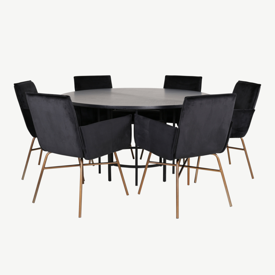 Sisusta oma kodu põhjamaise stiili ja ajatult soliidse elegantsiga! Copenhageni ümmargune must söögilaud toolidega ühendab endas moodsad jooned, kvaliteetsed materjalid ja tõelise mugavuse. Laud on valmistatud vastupidavast MDF-ist ning kaetud kauni musta spooniga, olles pilkupüüdev keskpunkt Sinu söögitoas. Komplektis on kuus Petra sametist söögitooli, mis lisavad luksuslikkust ning loovad meeldiva atmosfääri igaks koosviibimiseks.